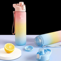 Equipped with a silicone straw so that you can easily open the cap and drink the water . The leak-proof dust cap can effectively prevent dust from entering your bottle. 32oz capacity and portable handle design make this water bottle an ideal choice for school, camping, sports, hiking, biking and outdoor travel. Made from premium BPA TRITAN PLASTIC with time markers, the bottle is perfect for your daily life. The gradient mixed color design makes it stylish and unique. 11.4173′ L x 2.7559′ W
