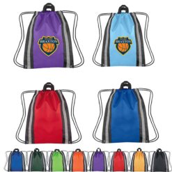 This durable drawstring backpack is made from 210D polyester with reflective strips for visibility. Perfect for bikers, hikers, campers, concert-goers, picnickers, and travelers worldwide. It has a carrying handle and metal eyelets for durability, making it a must-have for any adventure. 17″ L x 13.4″ W
