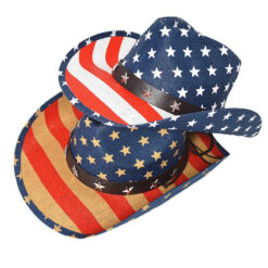 The cowboy hat features an imitation leather belt with five rivet stars and a colorful American flag design. Made of straw, it offers heat dissipation and sun protection with a wide brim. The hat has a moderate head circumference and is suitable for most people. Hand-woven with rivet badges, it is ideal for patriotic cowboys and cowgirls. Perfect for parties or speeches, as well as outdoor activities like fishing, horseback riding, and hiking. 22.794′ L