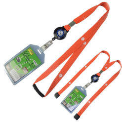 Lanyard with bulldog, metal crimp & plastic badge and card pouch. 31 1/2′ L x 9/16′ W