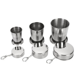 Stainless steel folding cup, perfect for travel, camping, hiking, and outdoor activities. Comes in 3 sizes: 8.5oz (250ml, 3 layers), 5oz (150ml, 4 layers), and 2.5oz (750ml, 6 layers). Durable, easy to clean, with key chain and lid for portability. Price is for 5oz, 150ml, 4 layers. Non-toxic, no metal taste or rust. Great for brand promotion with large print size. 2.5′ L x 2.3′ W x 2.3′ H