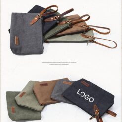 This stylish pouch features a sleek zipper closure, faux leather handle, and extra interior pocket for easy access to essentials. Made from high-quality Cotton Canvas, it is durable and versatile. Perfect for storing makeup or toiletries, this pouch helps keep your handbag clean and organized. Elevate your look with this elegant accessory. 9 1/2″ L x 2 3/4″ W x 6 7/10″ H
