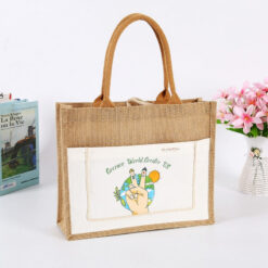 Quantity: 500 1,000 2,000 3,000 5,000 Your Price (each): $6.21 $6.04 $5.88 $5.72 $5.44 Our reusable grocery bag is eco-friendly and can help save 100 trees annually. It has a super large capacity, sturdy design, and can hold up to 30lbs for up to five years. The jute cloth material ensures it maintains its upright shape and is durable. The side front pocket is perfect for storing your essentials like your phone, keys, wallet, and purse. 17.7′ L x 5.11′ W x 21.4′ H
