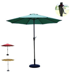 This outdoor umbrella has a unique design and is easy to open/close with a crank. The polyester canopy is durable and weather-resistant, while the aluminum pole resists rust. Adjust the tilt easily with the auto-lock system. Close and lock the umbrella in bad weather. Stay stable with 8 heavy-duty ribs, even in wind. Simple assembly and warranty included. 8.66′ L x 8.23′ W x 8.23′ H