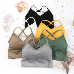 These seamless workout bras are made of high elastic fabric (90% Nylon, 10% Spandex) that is flattering, soft, sweat-wicking, and stretchy. They provide full coverage and feel like a second skin to keep you cool and comfortable. The wide band underneath ensures a secure fit for any movement. The strappy back style maintains your shape and pairs well with high waist leggings or jeans. 1′ L
