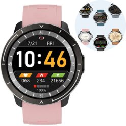 This waterproof smart watch has a 1.3″ color touch screen display with 300PPI resolution. It has a 240mAh battery for 15 days of standby time. The medical-grade chip tracks body temperature, heart rate, blood pressure, and blood oxygen. The brightness can be adjusted to four levels. It contains 24 exercise modes for better workout tracking. Overall, it is a versatile fitness tracker. 10″ L x 1 3/8″ W x 3/8″ H