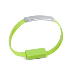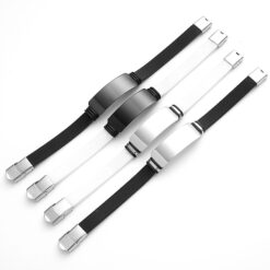 Elevate your style with this chic charging bracelet perfect for any occasion. The sleek design features a flat, flexible wristband with a metallic embellishment, blending elegance with sporty flair. It serves as a fashionable accessory and USB charging cable. The secure fastening keeps it in place and protects the ends from dust. Effortlessly connect phones, computers, and wall adapters. The USB plug doubles as the bracelet’s clasp, adding functionality to its stylish design. Stay connected and charged up in style with this trendy accessory that combines fashion and technology. 8.25″ L