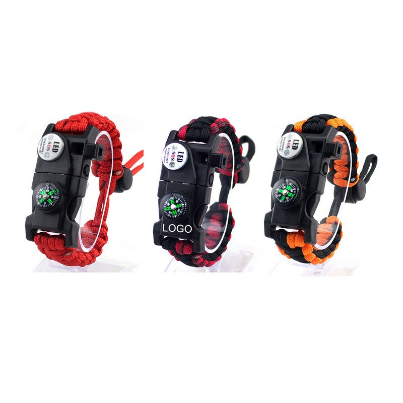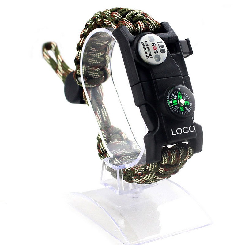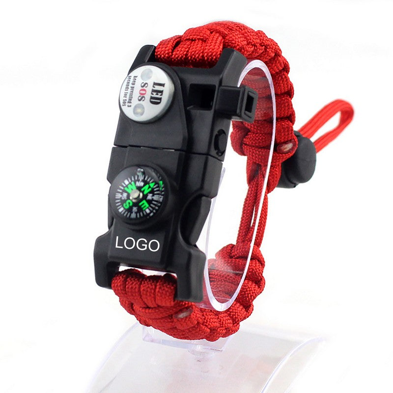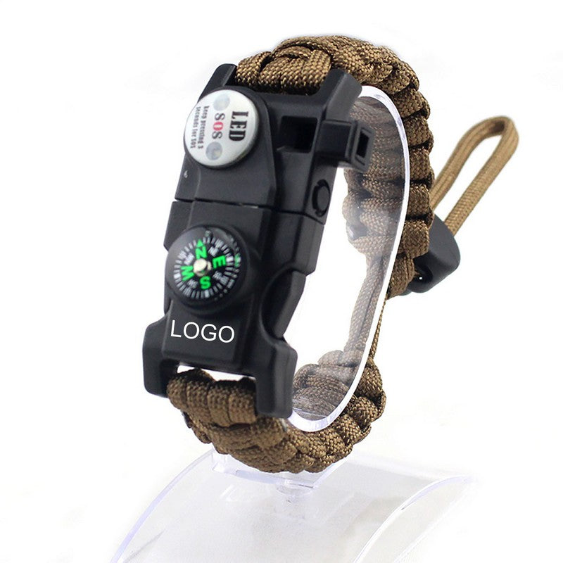 Illuminate your path with the SOS light compass, featuring LED, flashlight, and emergency flashing modes. It has a 10m lighting range and 72-hour flashlight mode. The compass assists with navigation and signaling, while the audible emergency whistle can be heard up to 500m away. The waterproof fire starter magnesium rod ignites fires in any weather. The multipurpose blade and tool card contains a knife, screwdrivers, and scraper. Customizable with your logo, these essential tools are perfect for any situation. 9.5′ L