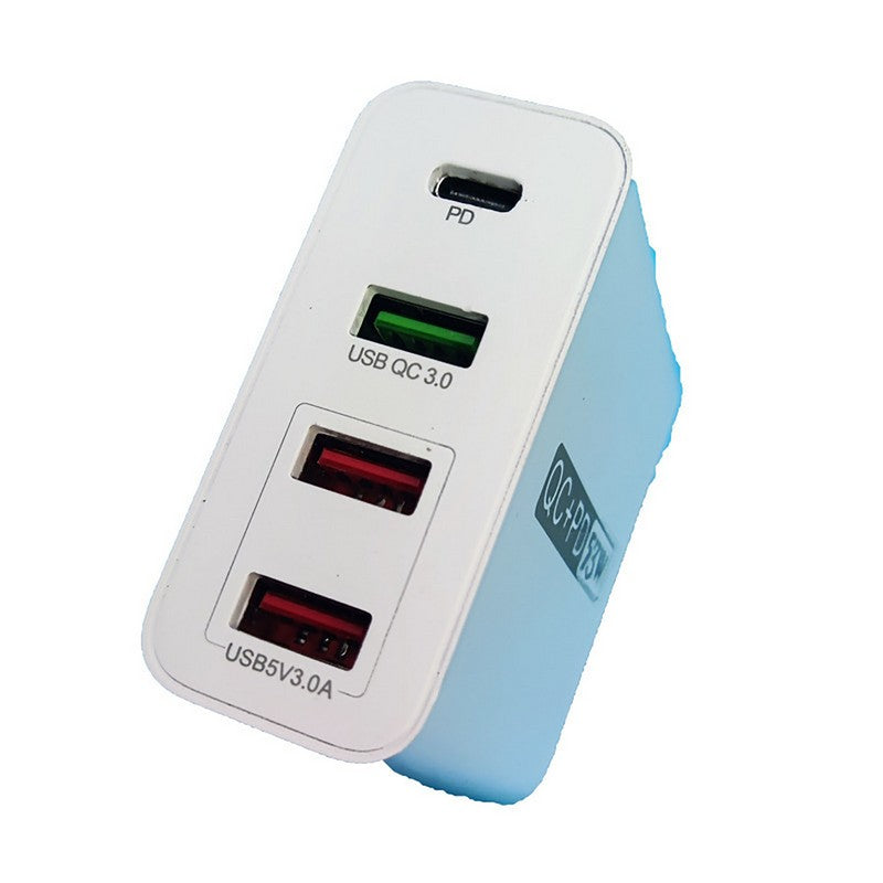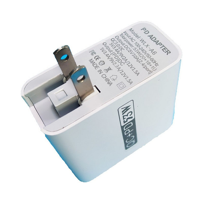 This 4-port wall charger has a total power output of 53W, with 1 PD 20W fast charge port, 1 QC 3.0 quick charge port, and 2 standard USB outputs. It’s perfect for charging multiple devices simultaneously with one compact charger. Its portable design fits easily into your pocket, suitcase, or backpack without scratching other items. Compatible with Phones and many other USB-powered devices. 2.55905511″ L x 1.18110236″ W x 2.36220472″ H