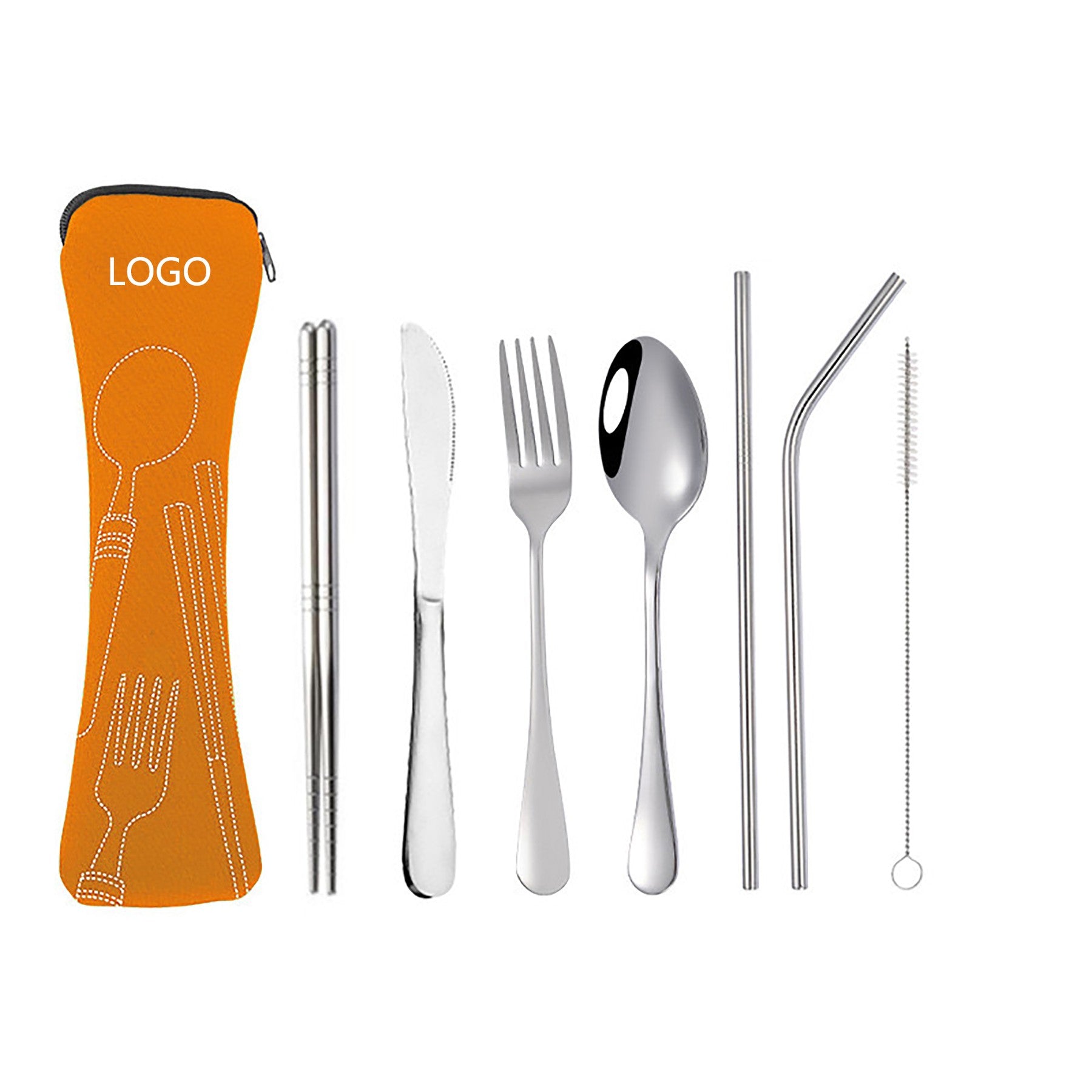The trendy kit makes a great table accessory for a dinner for 2 for everyday use, camping, BBQ or backyard parties, etc. It made of food grade stainless steel, which is rust-resistant, sturdy and durable. This set contains 2 forks, 2 spoon, 3 serrated knives, 2 plates, 1 bottle/wine opener and 1 cutlery storage bag. More color options and your logo is welcome. 9.5′ L x 9.5′ W x 0.25′ H