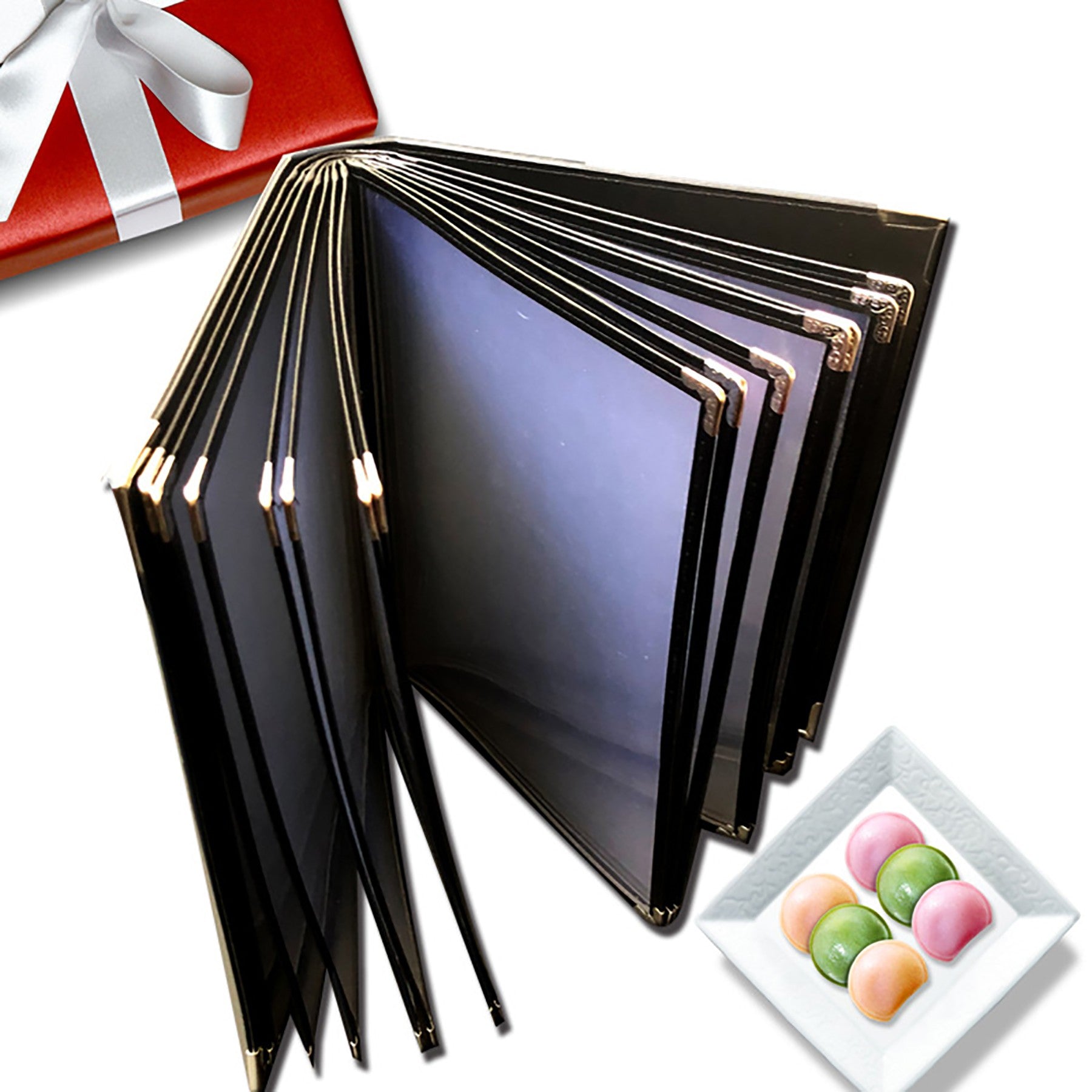 The quantity of nner sheets can be customized. This 2 sheets 4 pages restaurant menus folder is made of durable transparent flexible PVC, non-shattering, and non-toxic. Easy to clean. Each sheet of the clear protective menu book are sewn with leatherette trim and decorated with elegant gold metal corners. It fits for A4 standard letter size paper. It is Perfect for any food-service establishment,such as restaurant, hotel, cafe, porterhouse, noshery, pub, bar, etc. 11.69″ L x 8.27″ W
