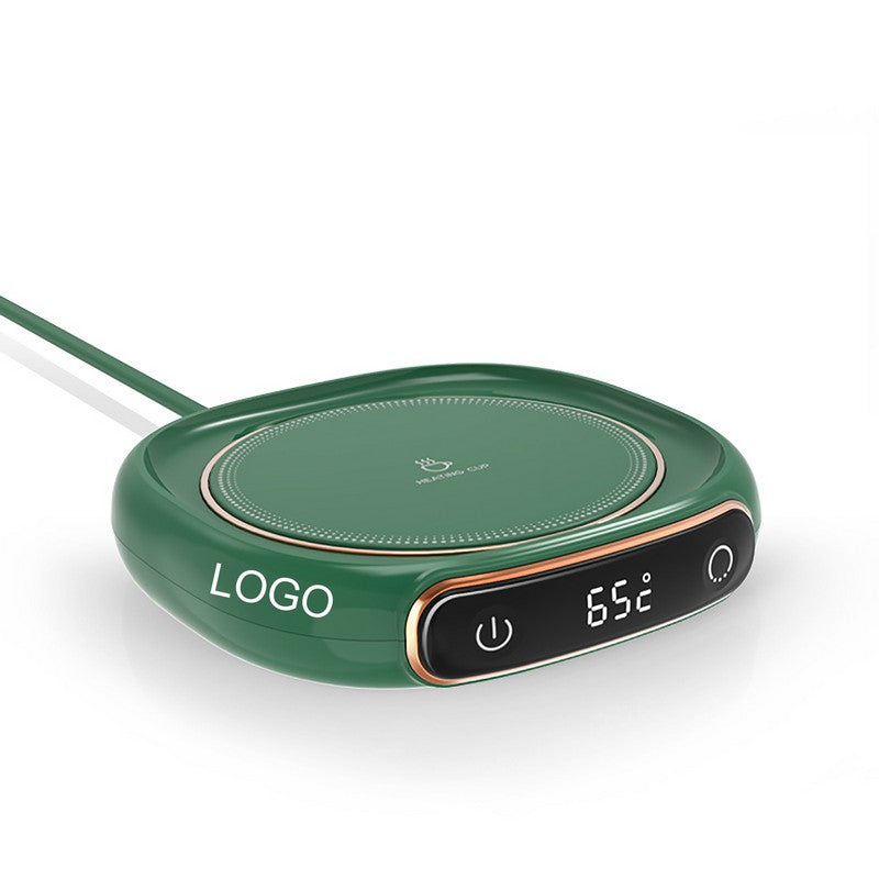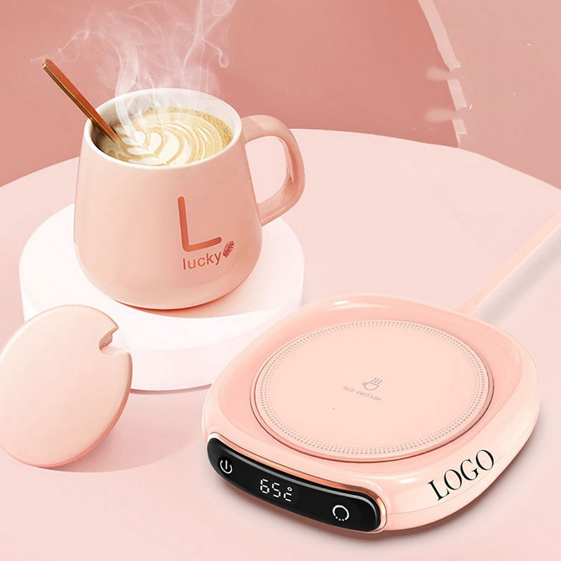 The heating coaster has three temperature levels: 55, 65, and 75 degrees. Press the button to cycle through the temperatures. The coaster automatically shuts off after 8 hours for safety. 5.12′ L x 4.33′ W x 0.91′ H