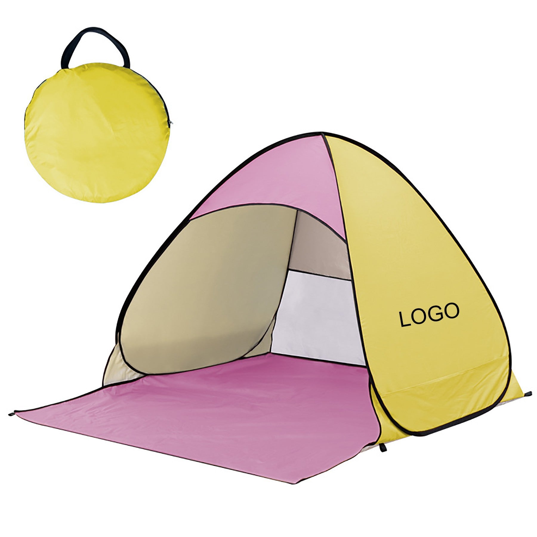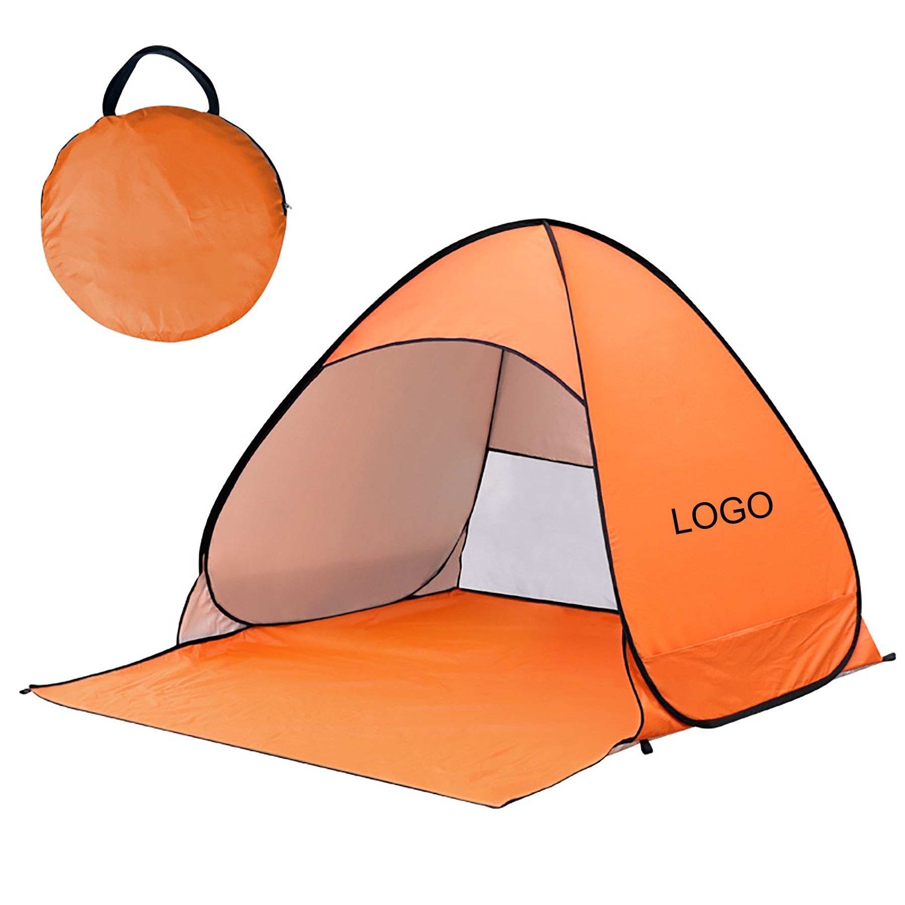 Made from waterproof Oxford fabric with UV protection coating, this tent comes with a skylight, ground nails, and windproof ropes for outdoor activities. It offers ventilation on all sides and can be customized with your logo in various colors. 94.5″ L x 94.5″ W x 60.6″ H