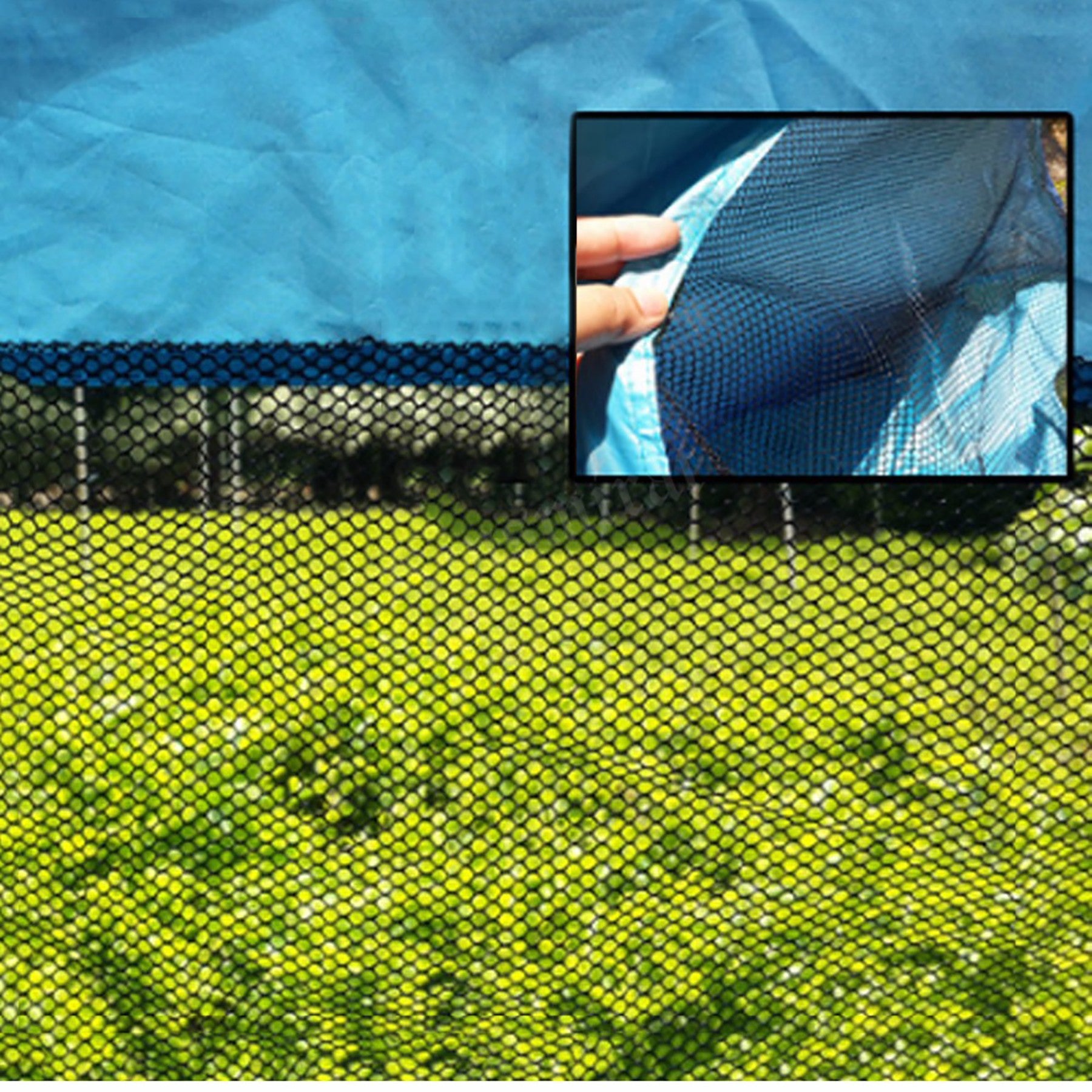 Our camping shade pergolas are lab tested for 20,000 hours of UV light, making them 80% more durable than recycled HDPE. The fabric is treated with a UV stabilizing compound to prevent drying out, tearing, and fading, blocking 95% of harmful UV rays. It reduces temperature and UV exposure in shaded areas during summer. The breathable fabric allows water and air to pass without pooling, is UV and water resistant, and requires no maintenance. Stainless steel D-rings at each corner allow for easy hanging, and heavy-duty stitching keeps them securely attached. 236.22′ L x 236.22′ W x 236.22′ H