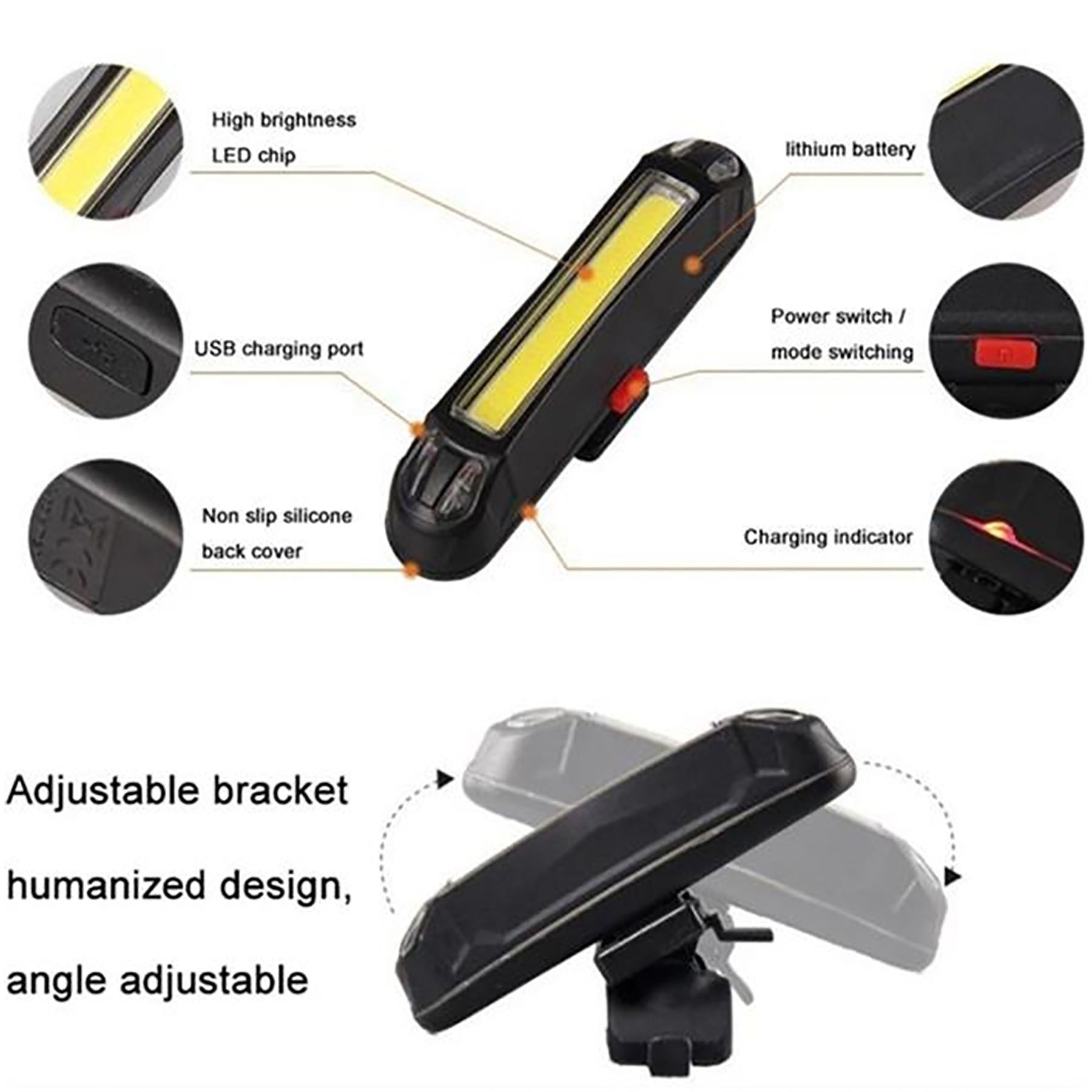 Light up your ride with the LED Waterproof Tail Light Bicycle Taillight – the ultimate bike lamp accessory. This rechargeable rear light features a super bright 100 lumens LED bulb for optimal visibility. Its compact, lightweight design and rainproof casing made of high-quality 100% new PC + ABS material make it perfect for various applications like running, cycling, and more. Easy installation with the versatile silicone strap means you can say goodbye to dimly lit rides and hello to safety and style. 3.1″ L x 0.6″ W x 0.8″ H