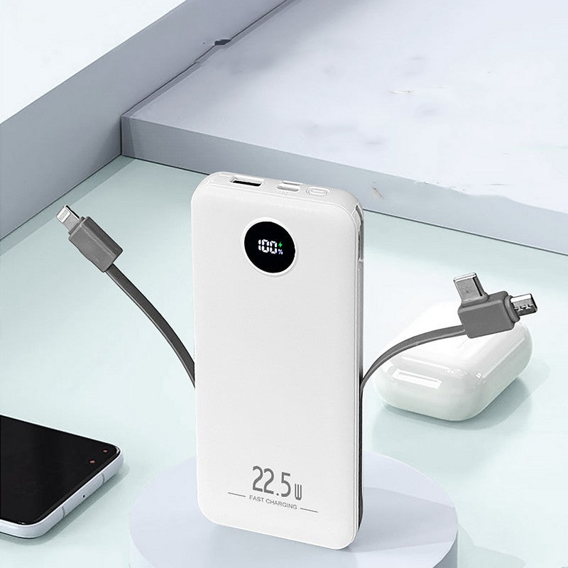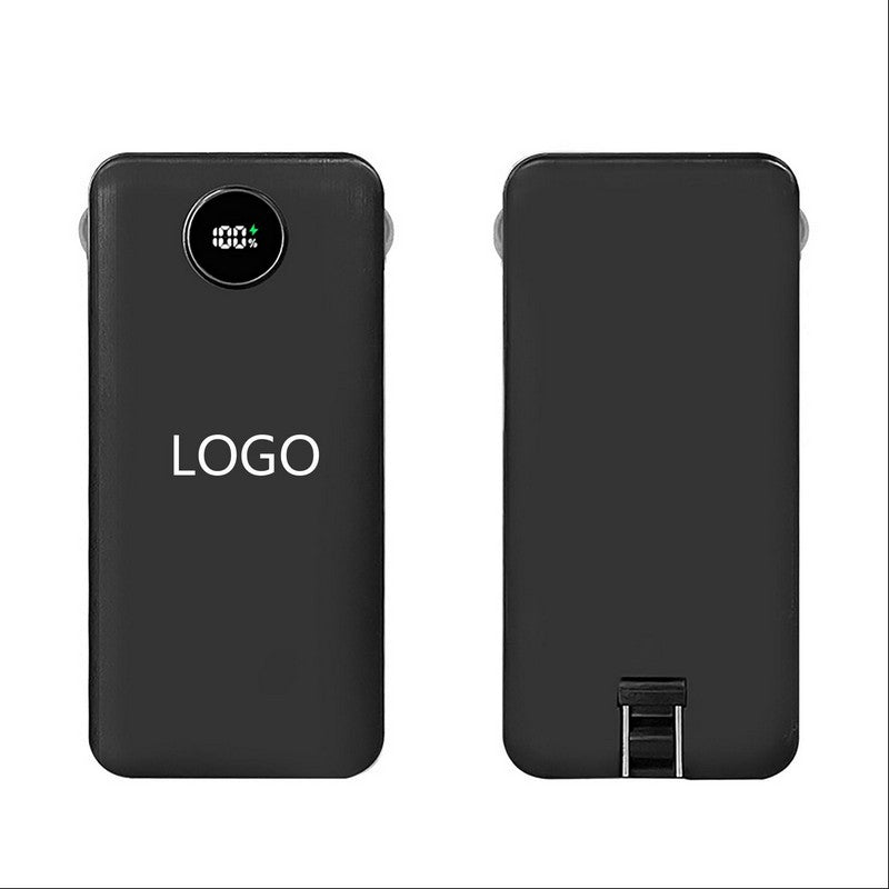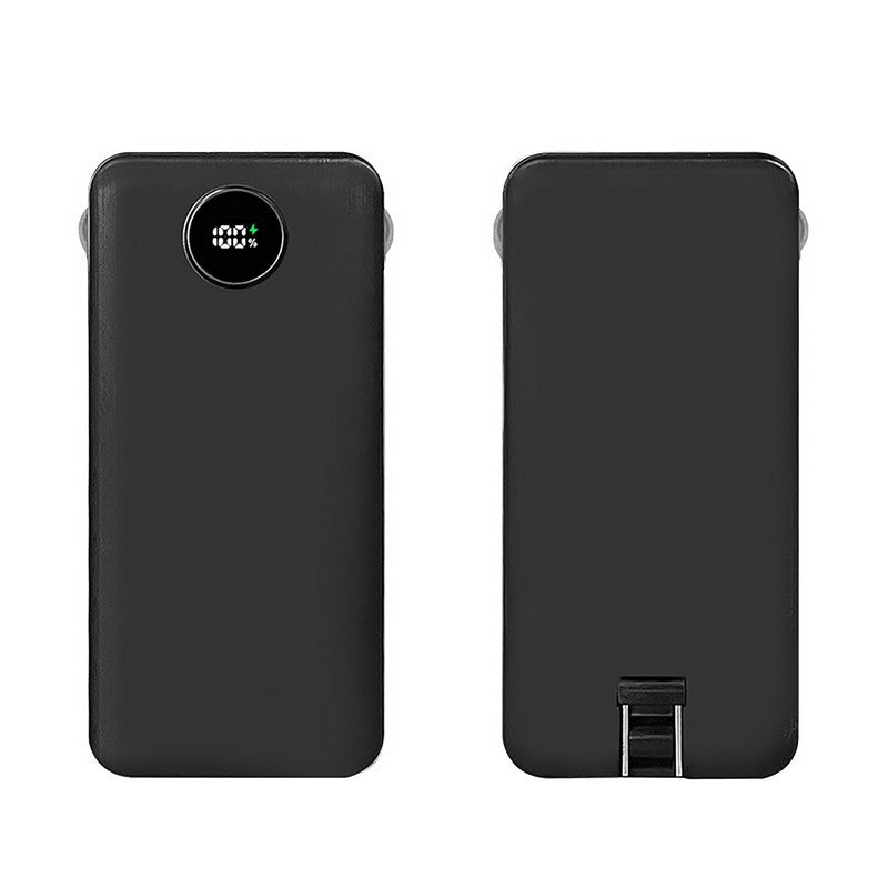 Experience the ultimate convenience with our 22.5w fast-charging power bank. With its sleek rectangular design and circular digital display, keeping track of your battery life has never been easier. The built-in dual-port retractable charging cable means no more tangled cords, allowing you to charge your phone and headphones simultaneously. An extra port on top caters to all your charging needs. The high efficiency of 22.5w fast charging ensures your devices are powered up quickly. Its compact size makes it perfect for on-the-go use, whether you’re commuting to work or enjoying a day out. Say goodbye to low battery anxiety with this reliable and portable power bank. 5.91′ L x 3.15′ W x 0.59′ H
