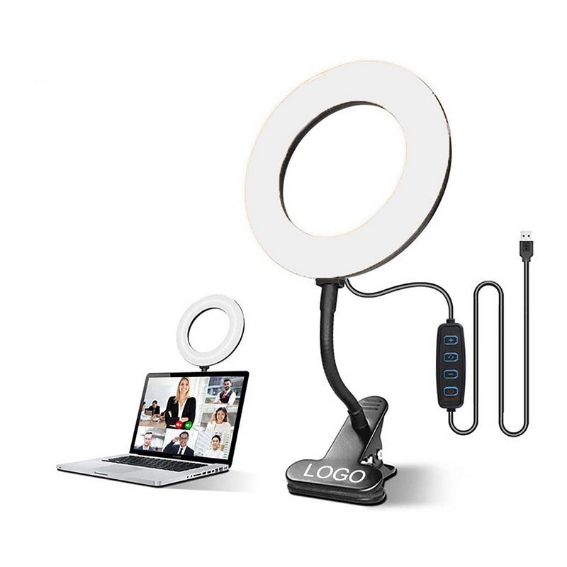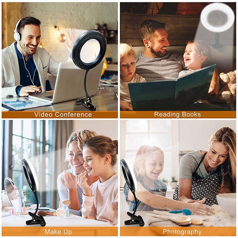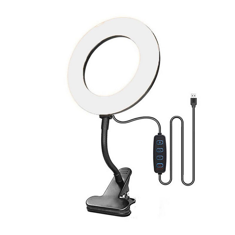 This mini ring light has 56 LED beads with 3 color lighting modes (warm, warm white, white) ranging from 3000k-7000k. Each mode has 10 brightness levels from 1% – 100%. The flexible gooseneck design allows for easy positioning without scratching your monitor screen. The light can be used behind a computer or clamped onto various surfaces for video conferencing, recording, or reading. It is USB powered and compatible with devices that support a USB port. No batteries required. 5.8′ L
