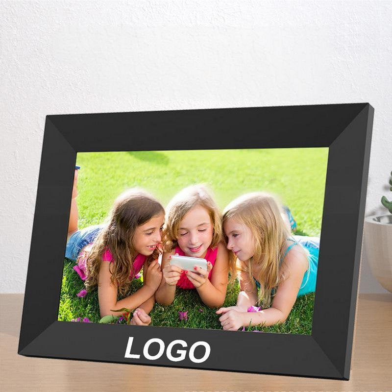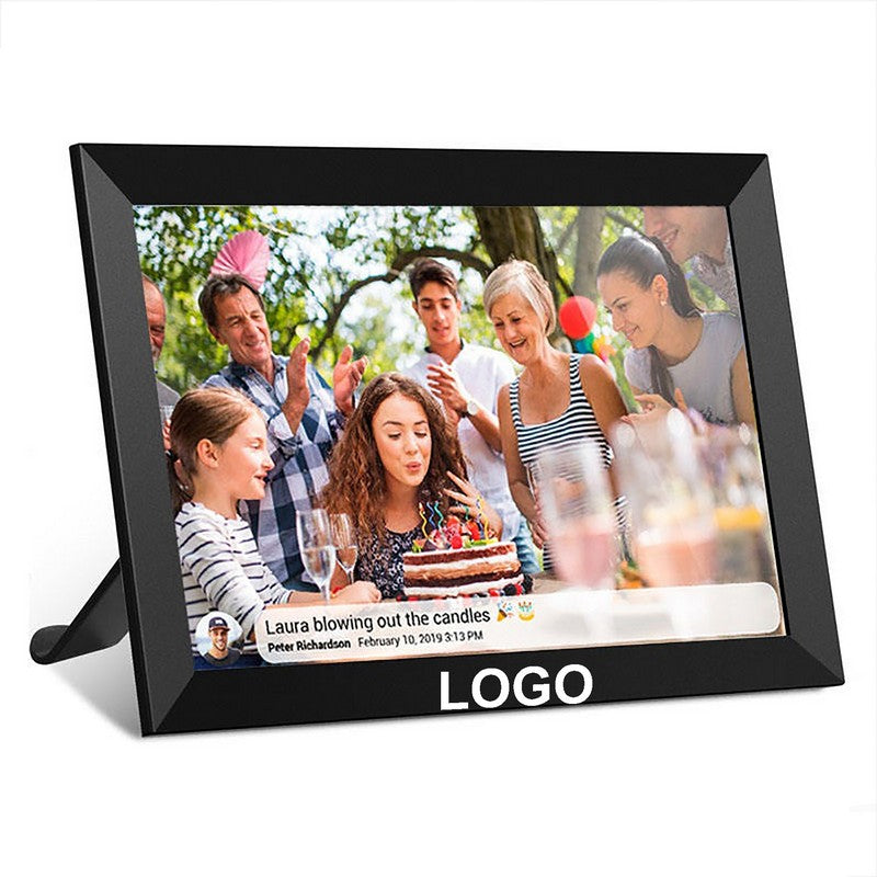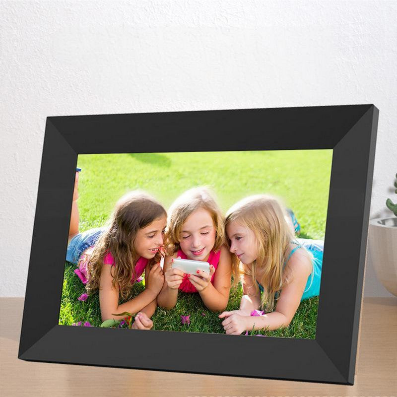 This digital photo frame features a 1280*800 resolution IPS touch screen for clear visuals, with a removable stand for portrait or landscape viewing. The display shows title, weather, and clock, which can be turned on/off with software updates. Easy setup with an intuitive touch screen interface suitable for all ages. A perfect gift for birthdays, weddings, and family gatherings. 15.59′ L x 0.47′ W x 0.47′ H