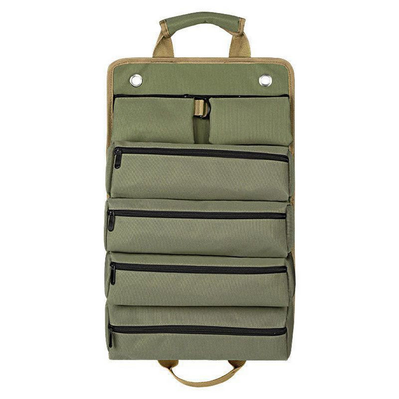 High quality tool roll up bag made of water, grease, and rip resistant oxford cloth. Keeps tools safe in extreme conditions, wear and tear resistant. Multi compartment design for storing and classifying tools. Compact and space-saving. Ideal for various trades. 19.49′ L x 12.6′ W x 12.6′ H