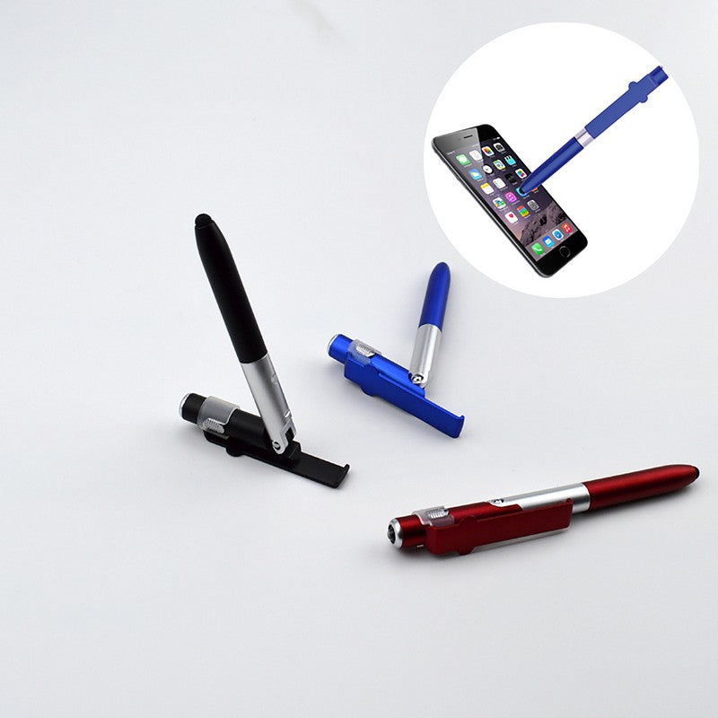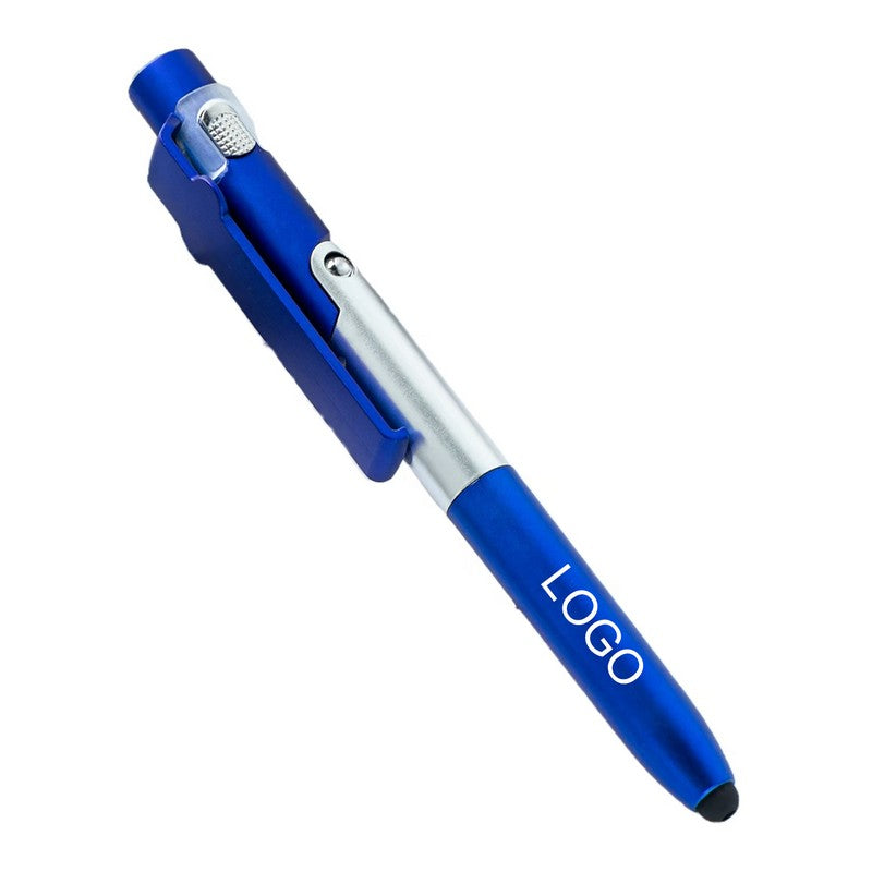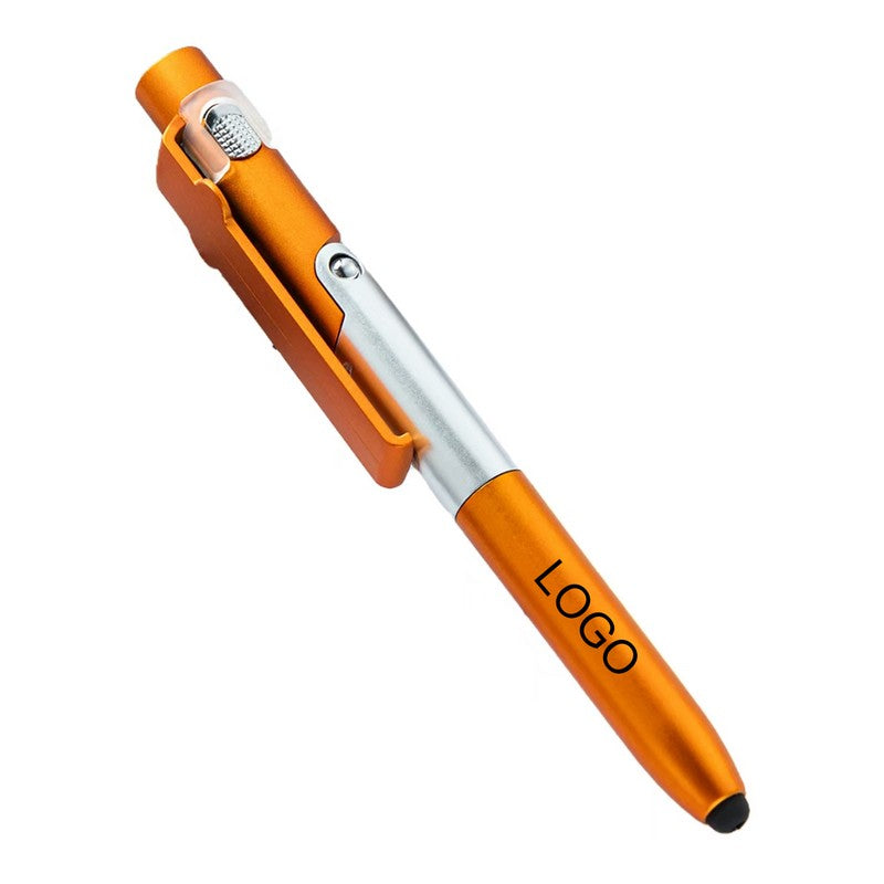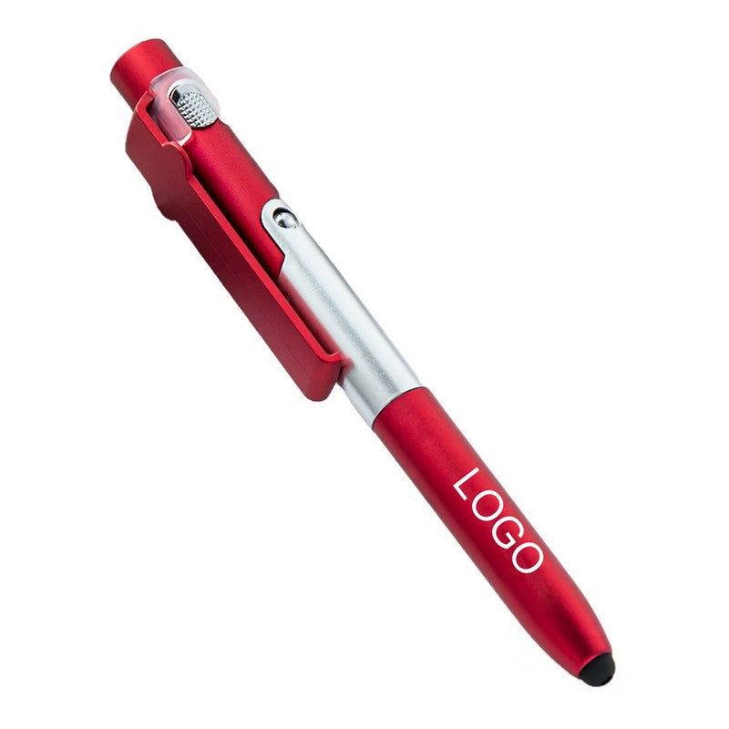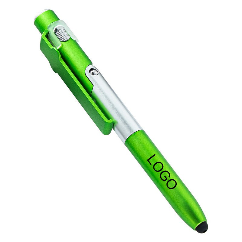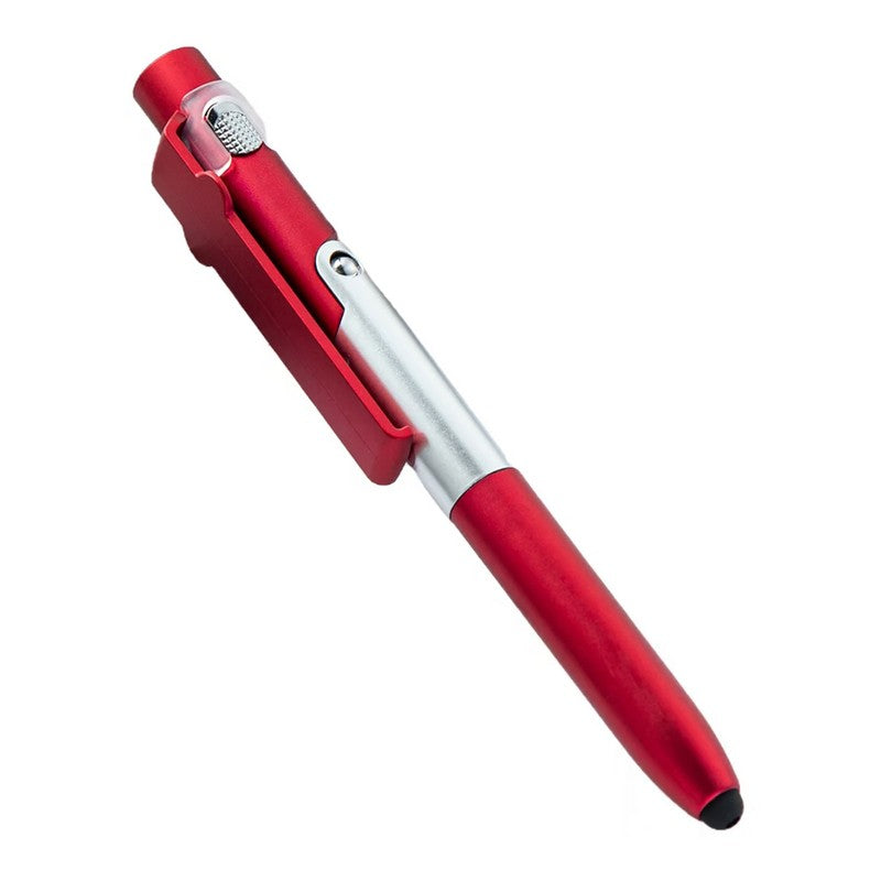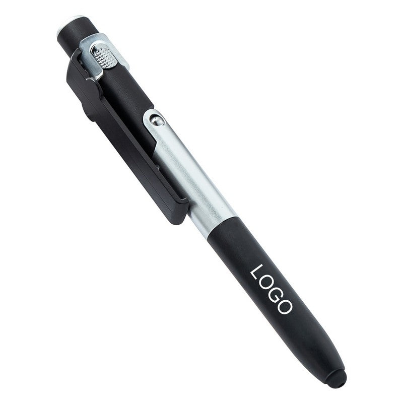 Introducing our versatile pen made from durable ABS plastic with a twist-action mechanism and soft silicone stylus tip for touchscreen devices. It can transform into a phone or tablet stand with a simple unfold, and has a built-in screen cleaner on the cap. Plus, it features a mini LED flashlight for added functionality. Perfect for school, office, or home use. Upgrade your writing experience with this innovative tool. 5.5′ L x 0.59′ W