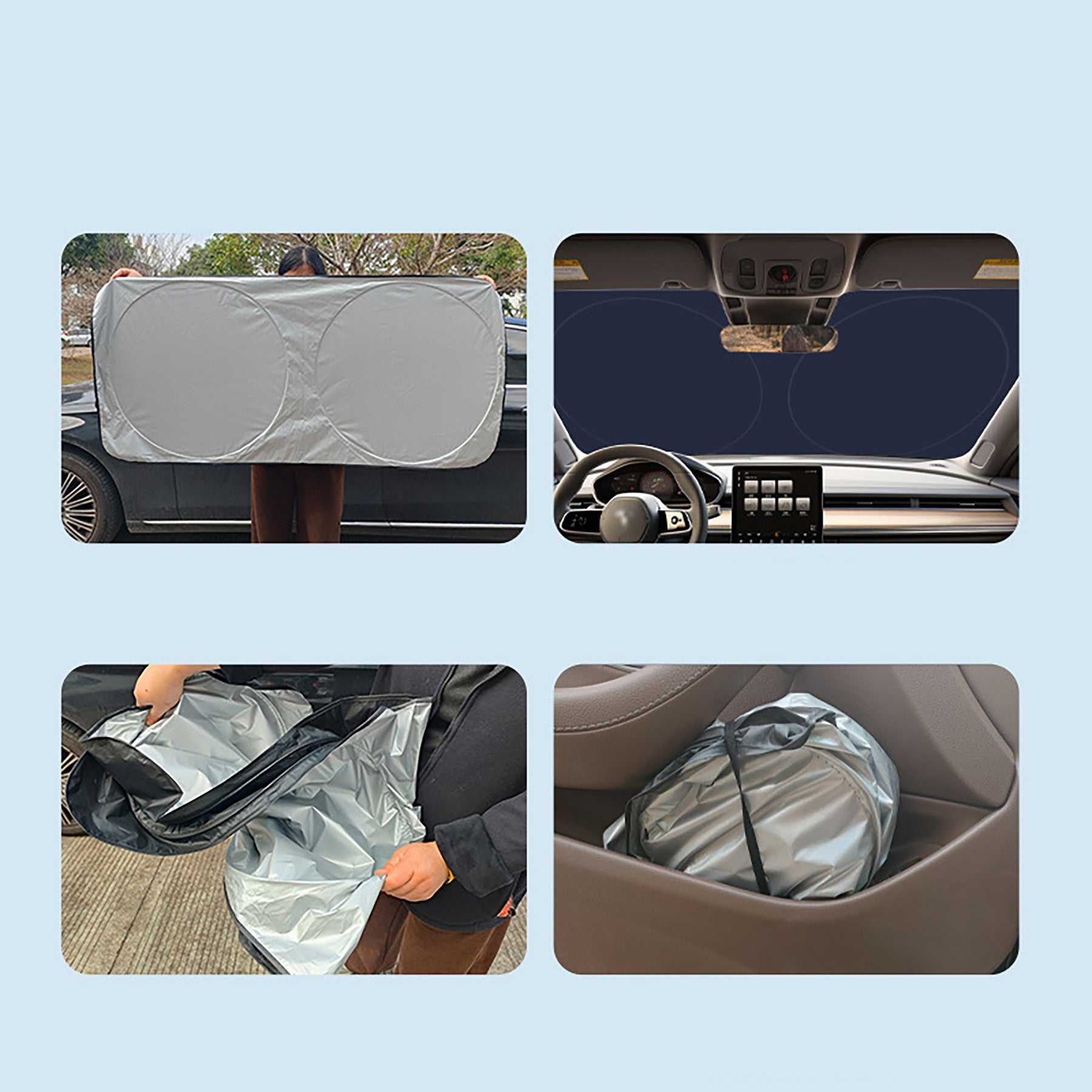 This car’s sunshade windshield adopts upgraded laser reflective fabric and double-layer insulation technology, which can block up to 99% of harmful ultraviolet rays and high temperatures. It helps prevent cracking and fading on the dashboard and seats, while keeping your car cooler. This car windshield sunshade is foldable and can be placed in your car’s door pocket or center console, stored in the included small bag. Very suitable for daily use, very suitable for drivers who value convenience. The car windshield sunshade adopts a unique overlapping design, which tightly fits the car window and will not fall off. In addition, it reduces cabin heat faster, lowers ac energy consumption, and eliminates high-temperature odors from leather or plastic. 57.09″ L x 31.5″ W