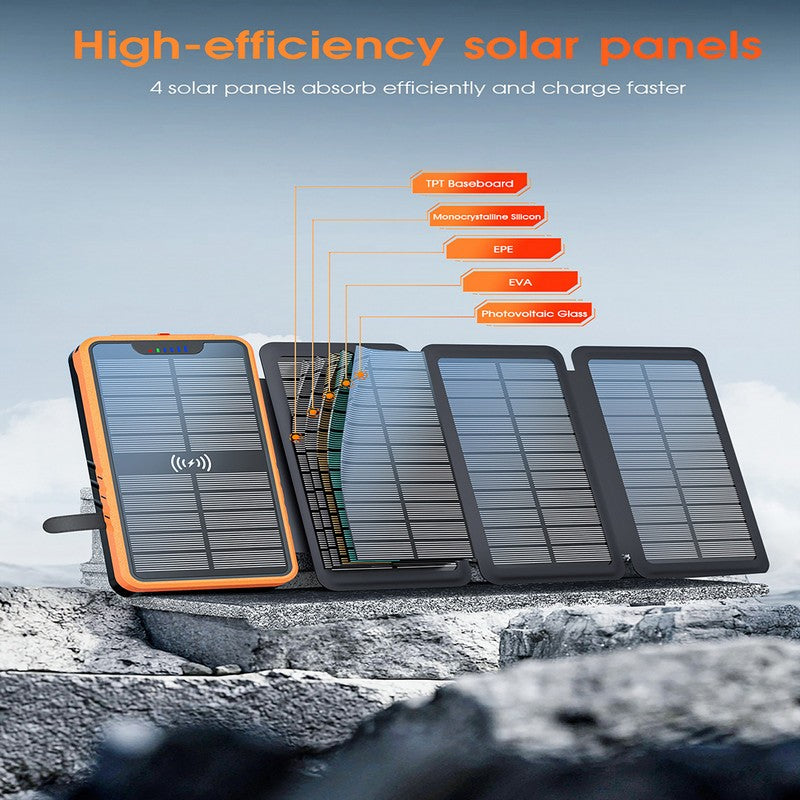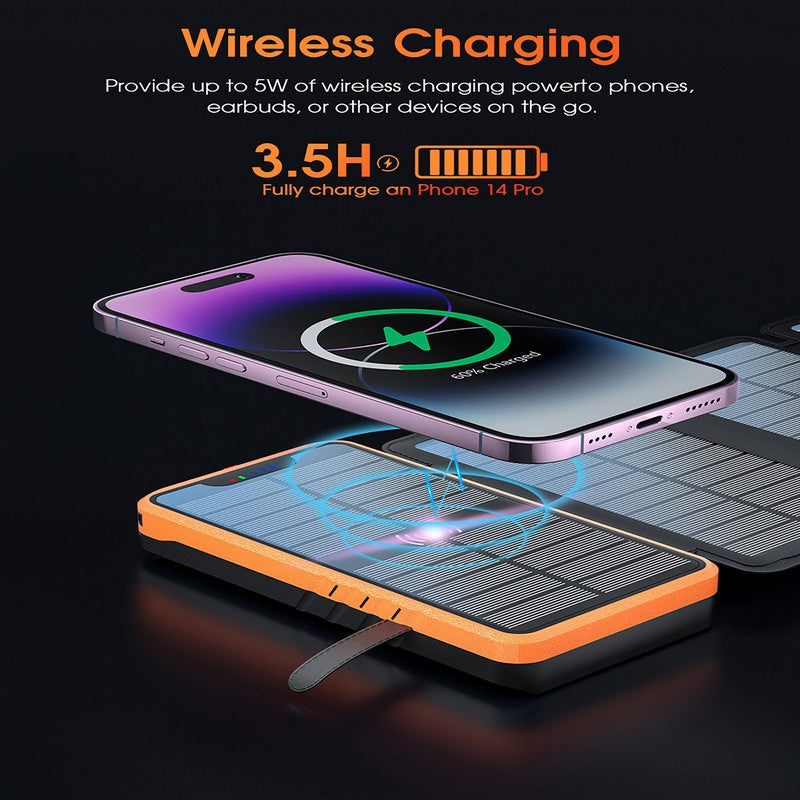 33800mah solar powered wireless power. Not only a wireless power, but also a wireless charger. The solar battery is equipped with bright leds with three brightness levels, you can adjust the brightness according to your needs, three modes of light can be used as sos flashlight and strobe, a must-have tool for outdoor sports enthusiasts, but also for emergency situations such as sudden power outages caused by typhoons and hurricanes. 6.38′ L x 3.46′ W x 1.4′ H