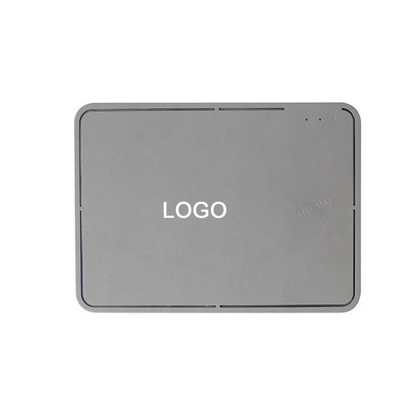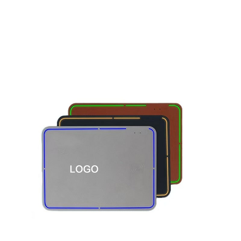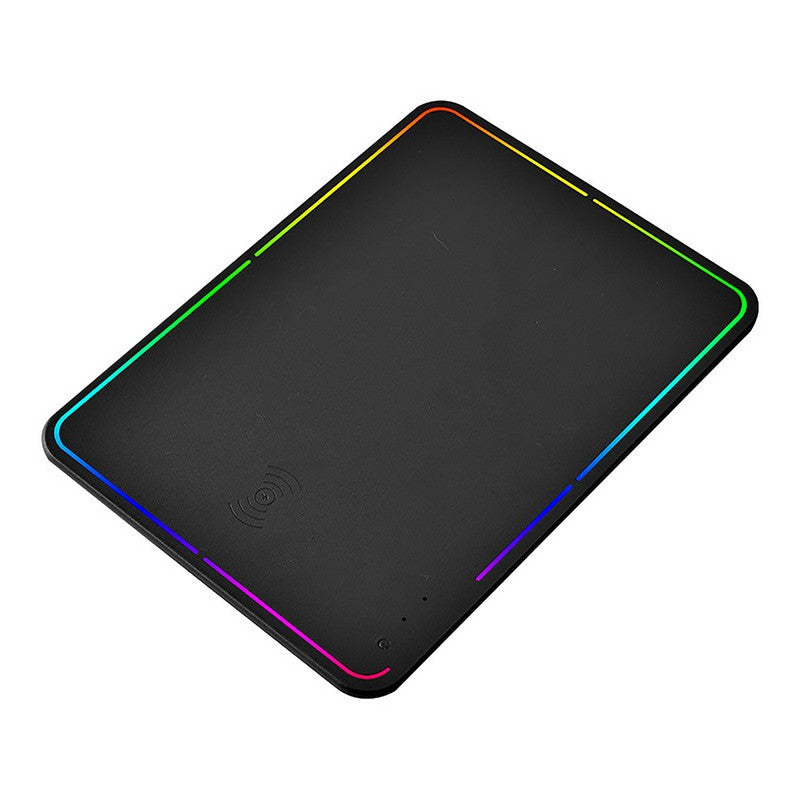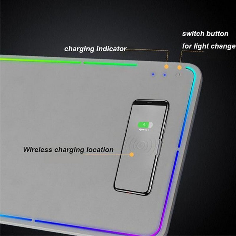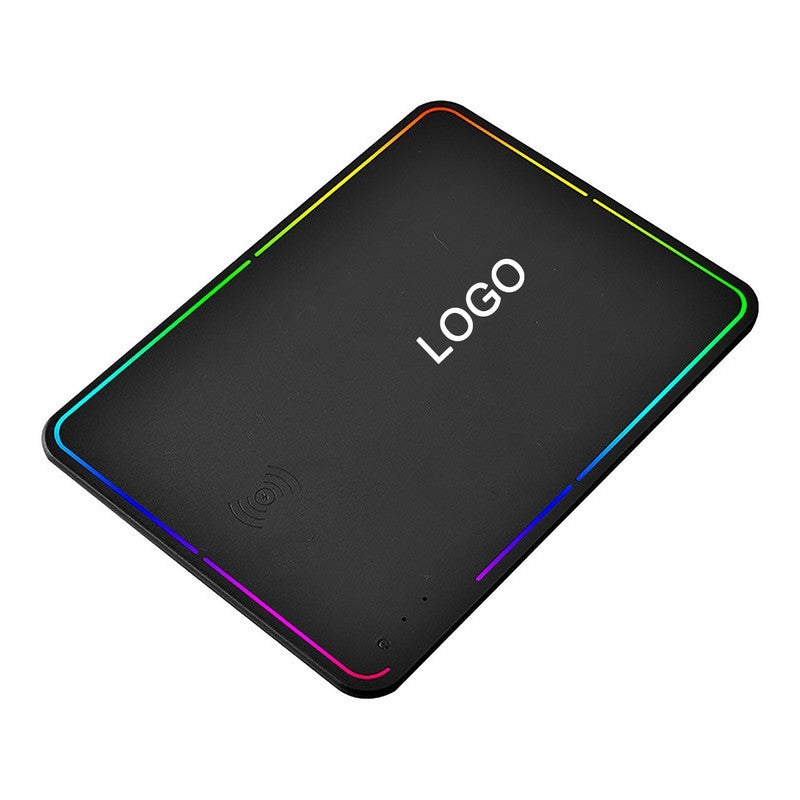 Upgrade your brand with this premium 10W QI wireless charger RGB mouse pad made of PU material. It features 12 lighting modes, contains static colors, breathing, rainbow, and rolling effects. Compatible with most plastic phone cases, it comes with a micro to USB cable. With impressive specs like 9V 2/1.67A input, 100-200KHZ working frequency, 70%+ conversion efficiency, and 3-8mm transmission distance, it provides fast charging for wireless charging-enabled phones. The non-slip rubber bottom ensures secure placement on any surface. A must-have accessory for your brand. 11.81′ L x 8.66′ W x 0.236′ H