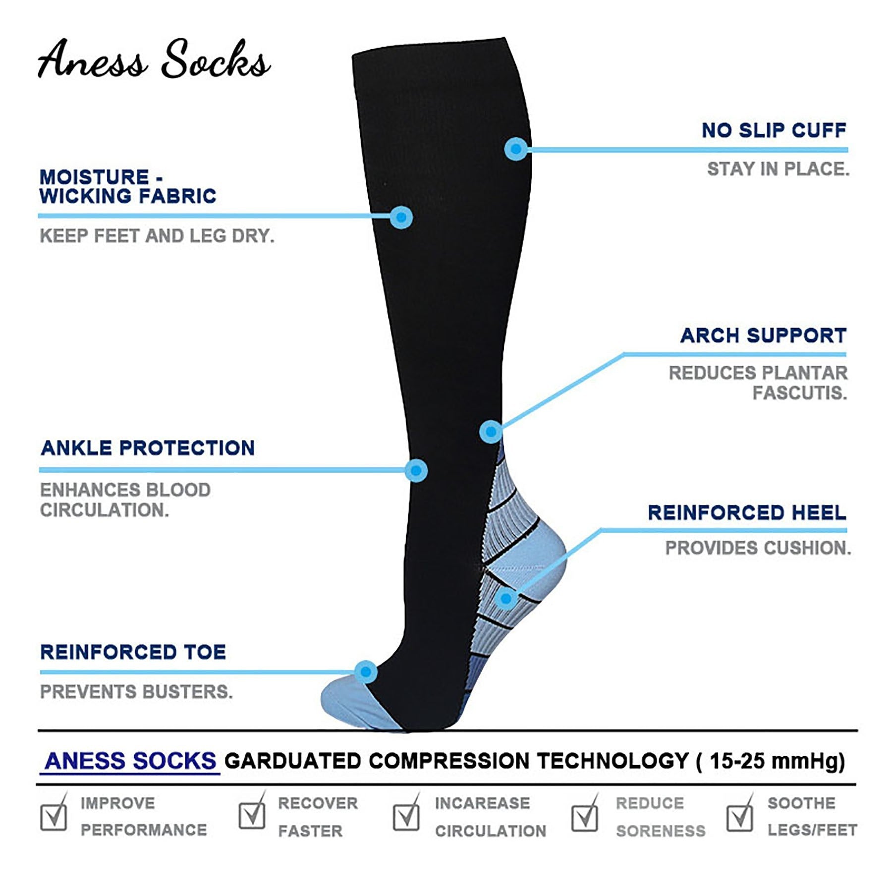 Introducing our durable compression socks, designed for lasting quality and comfort. Perfect for work or play, these socks provide strategic compression and support for your legs. Our moisture-wicking technology keeps you dry and comfortable. No more annoying stitches or discomfort, thanks to our thoughtful design. The stay-put cuffs offer support without pinching. Slip on these socks for any challenge, from CrossFit to half marathons. Perfect for extreme races and long runs, a must-have for any active lifestyle. 11″ L x 5 4/8″ W x 1″ H