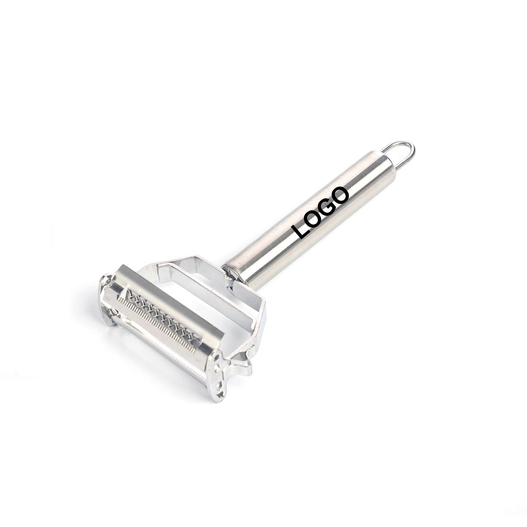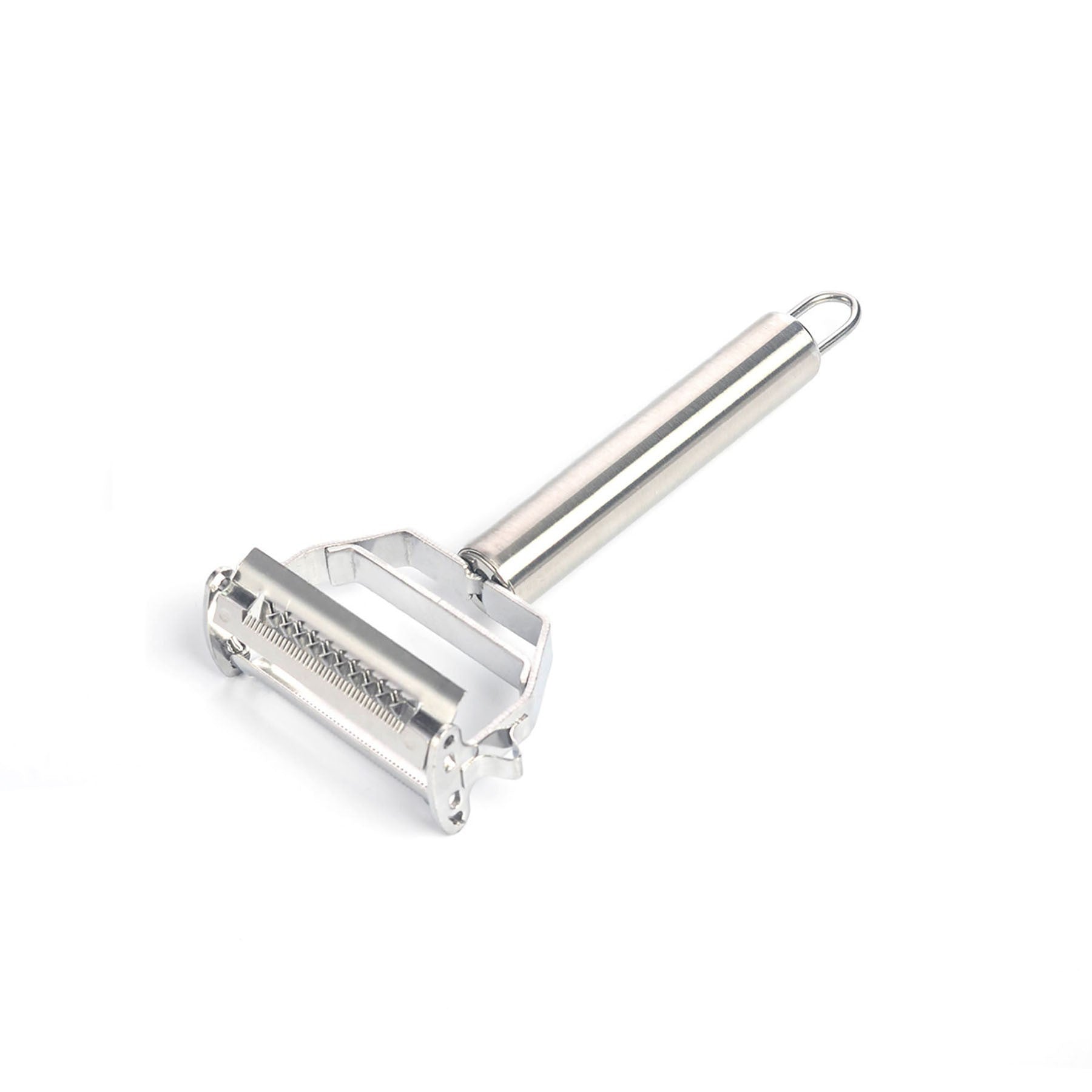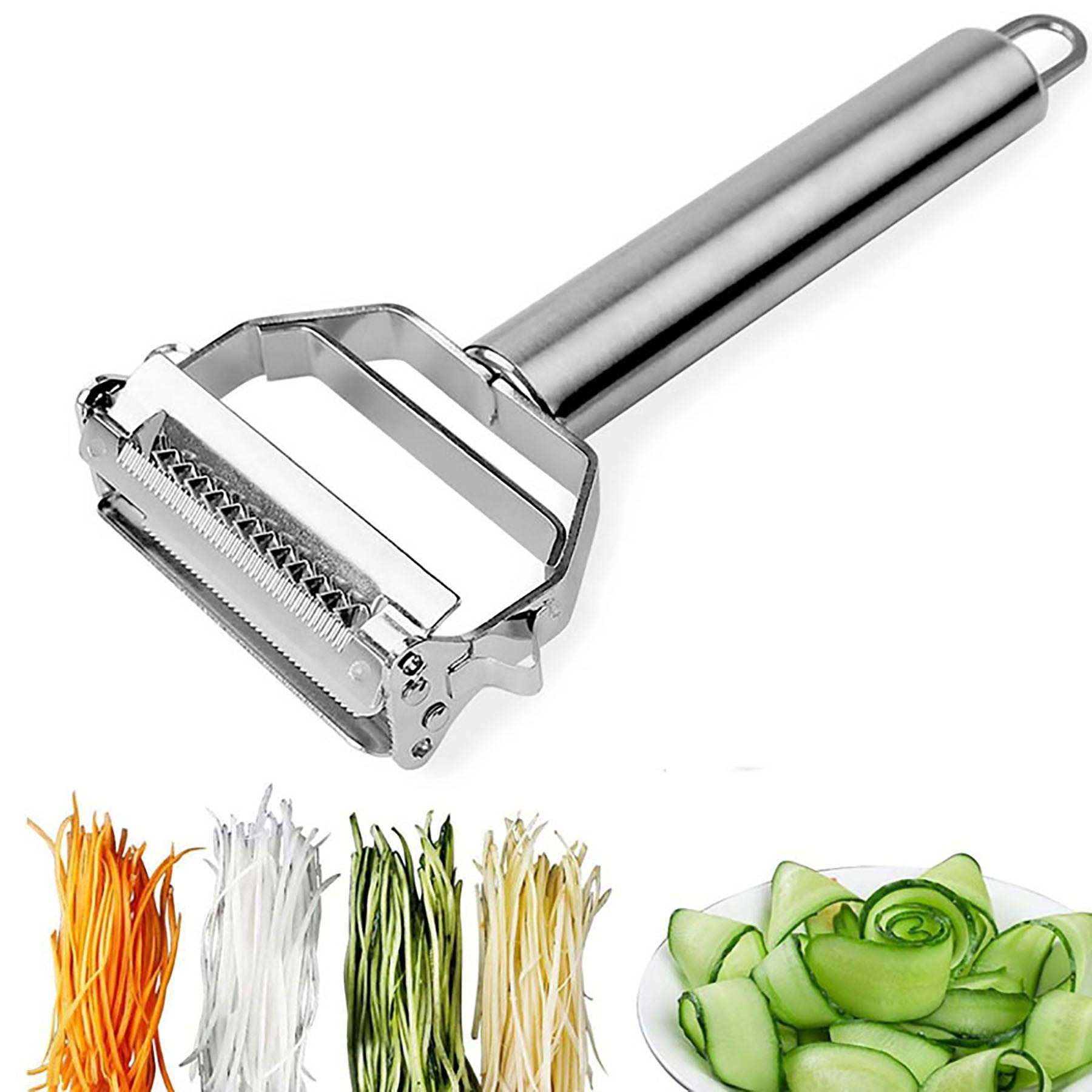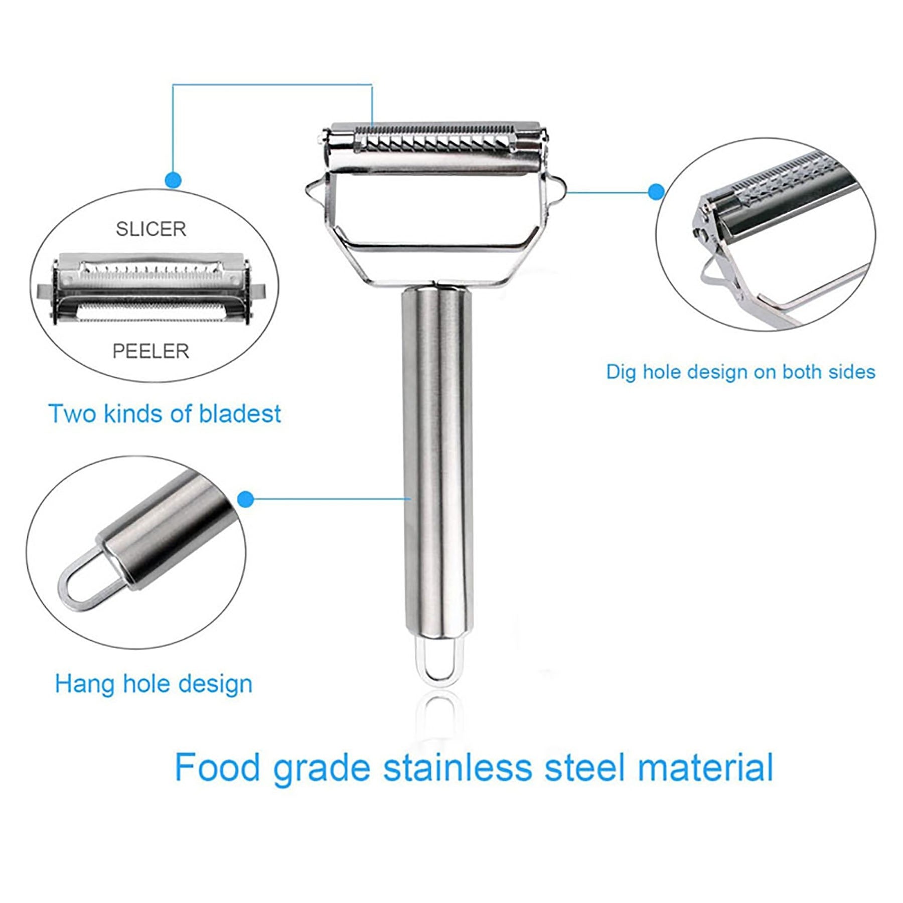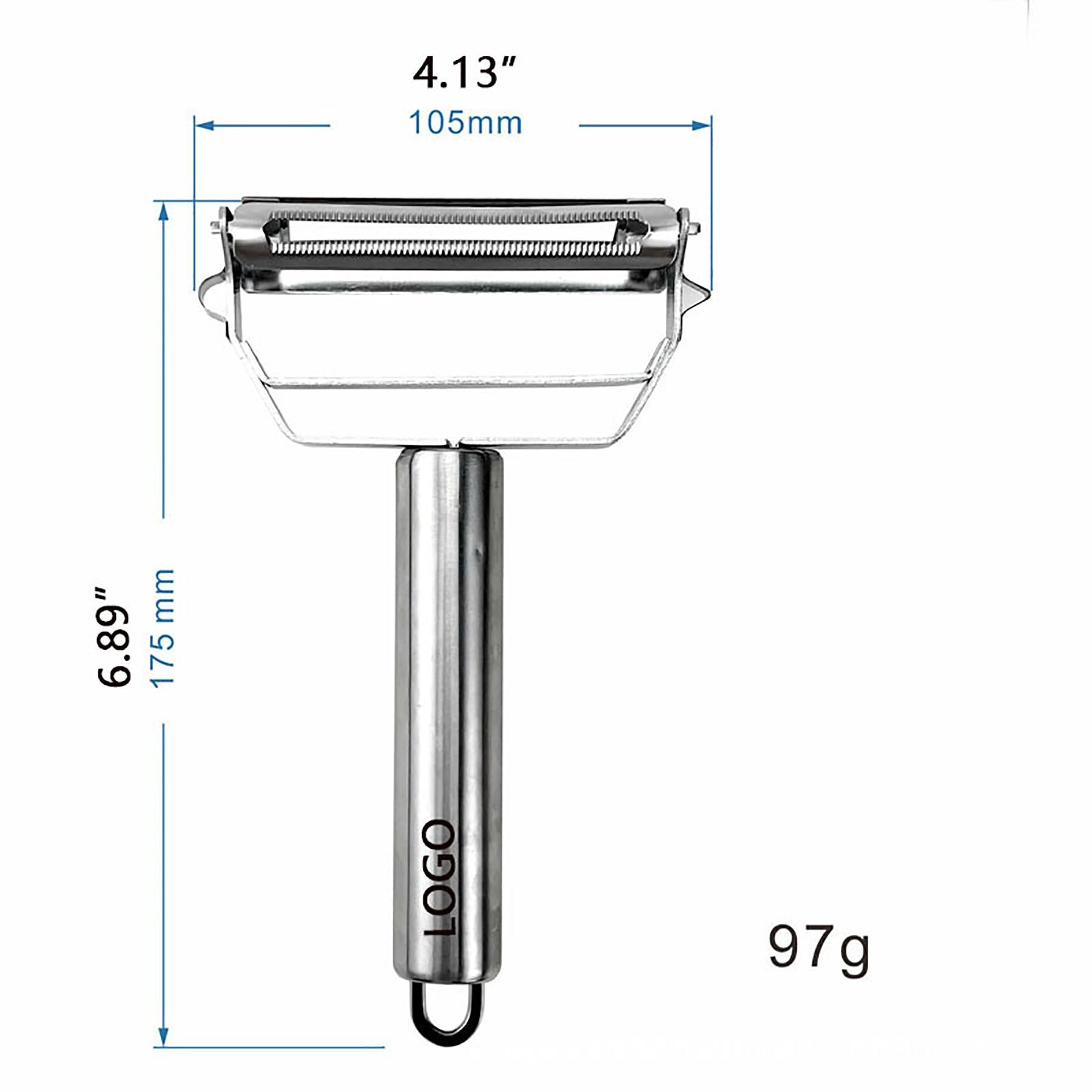 This stainless steel peeler has two razor-sharp blades for peeling and slicing fruits and vegetables quickly and safely. It is designed with anti-cut features, a comfortable grip, and a hook for convenience. Dishwasher safe and perfect for making sandwiches, cheese rolls, or salads. 7″ L x 3.1″ W