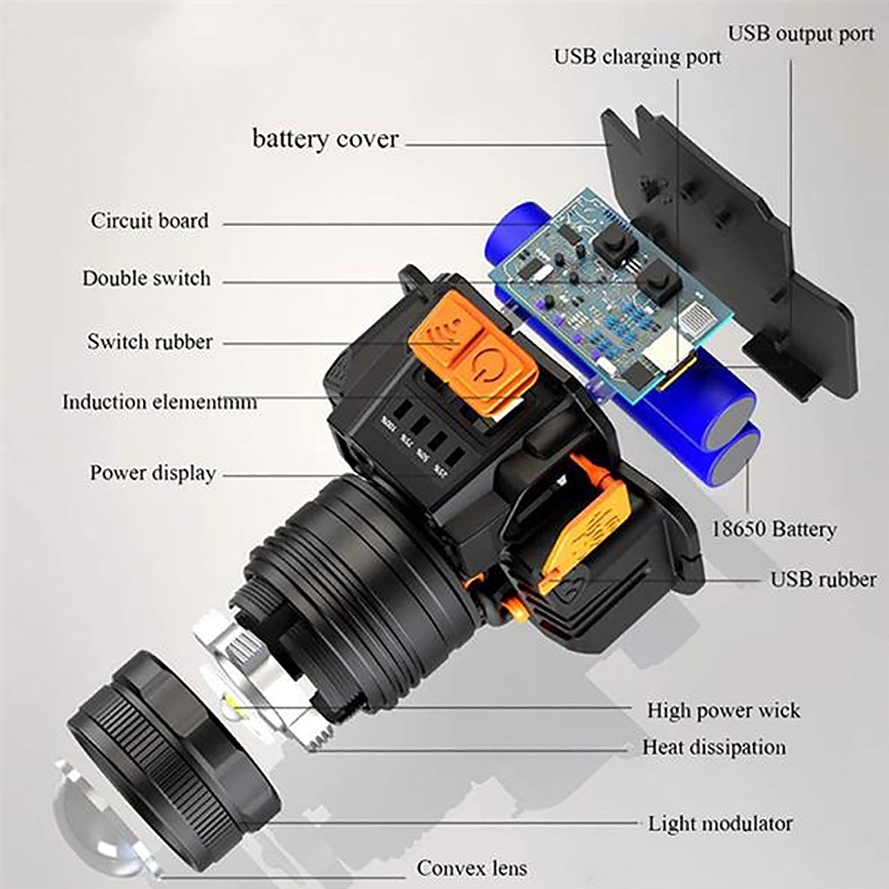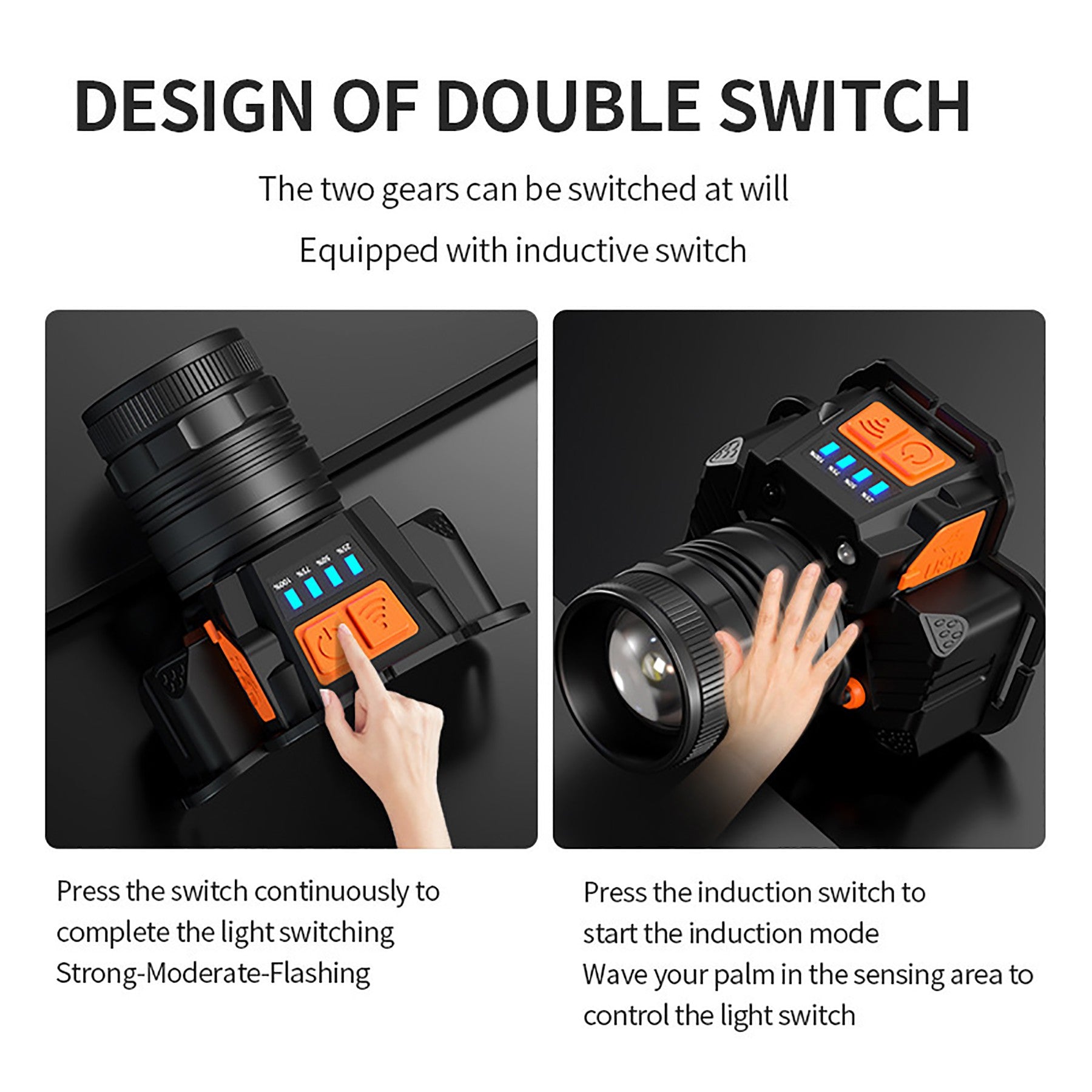 Brightness can be up to 800 lumens, Lifespan reach up to 100,000 hours, The head of the headlamp can be 90 degrees rotating, and the headband is elastic, comfortable wearing. The rechargeable headlamp flashlight has 3 light modes(High brightness/Normal brightness /Strobe ) 2×18650 3.7V batteries included; it can be rechargeable. A great lighting system for fishing, cycling, Imprint is available! 58″ L x 14″ W