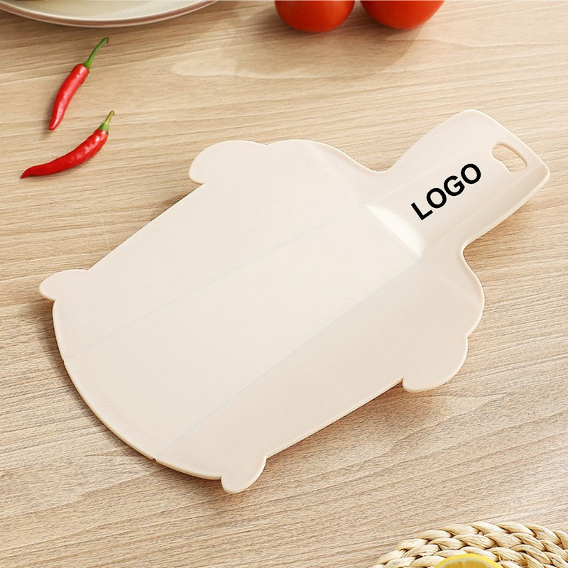 Fold able cutting board for food preparation and chopping. Can be used as a regular cutting board and offers a durable, knife-friendly cutting surface when you squeeze the handle, the cutting board folds up so that food can be neatly guided into a bowl or pan without any spillsnon slip, dishwasher safe surface. The cutting board features a unique folding design that takes the clutter out of food preparation. It can be placed flat on the kitchen counter top or used as a regular chopping board. Once the chef has finished chopping, the cutting board can be folded up at the ends to neatly place ingredients into bowls, pans or containers, thus avoiding splatters. 12.6′ L x 8.27′ W x 8.27′ H