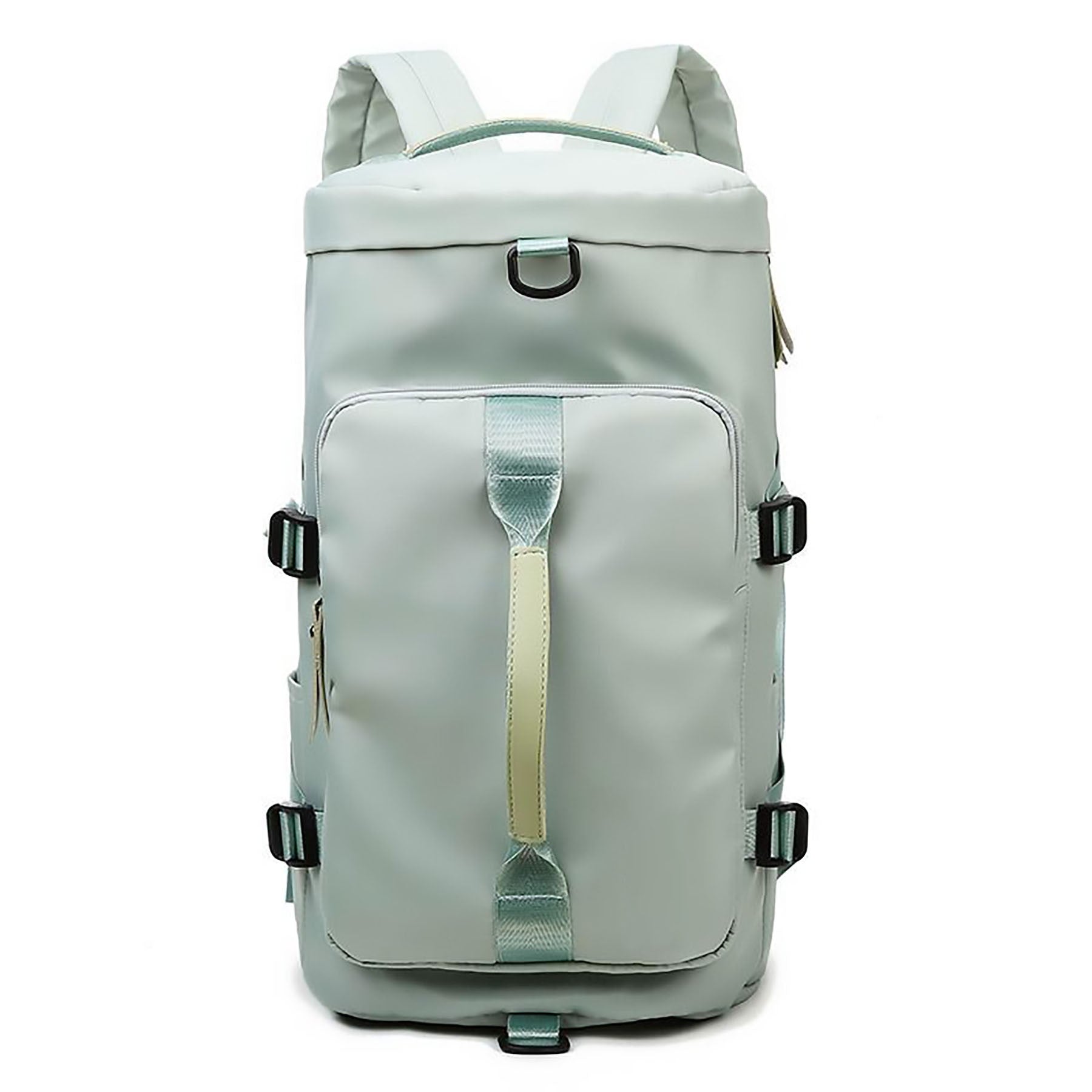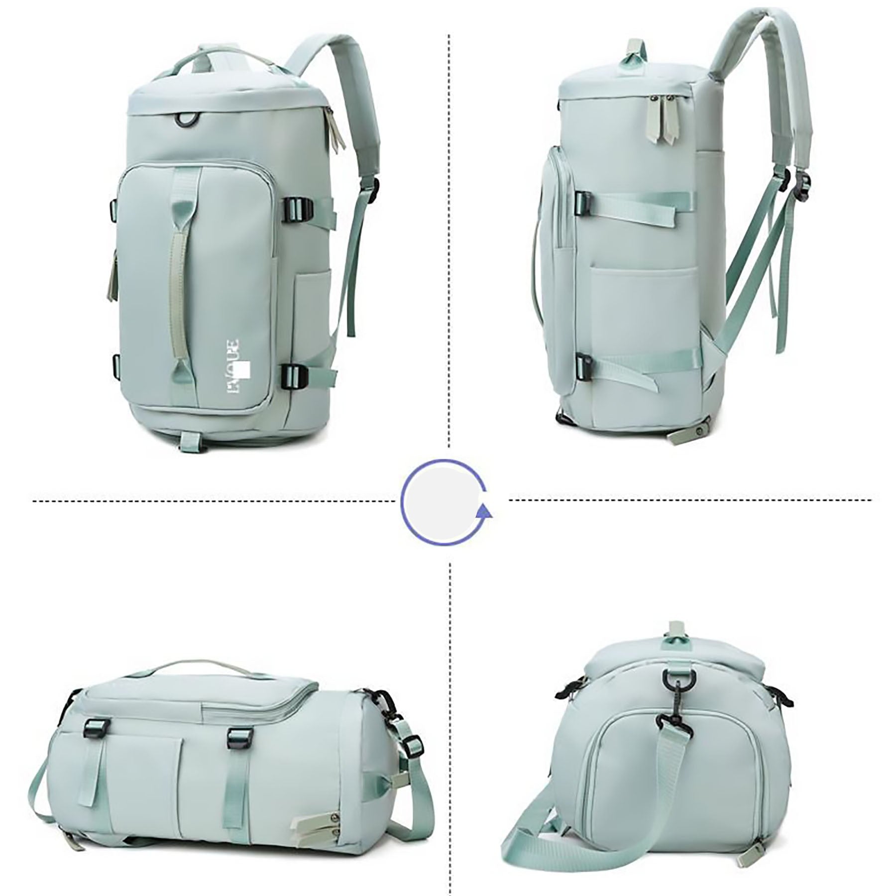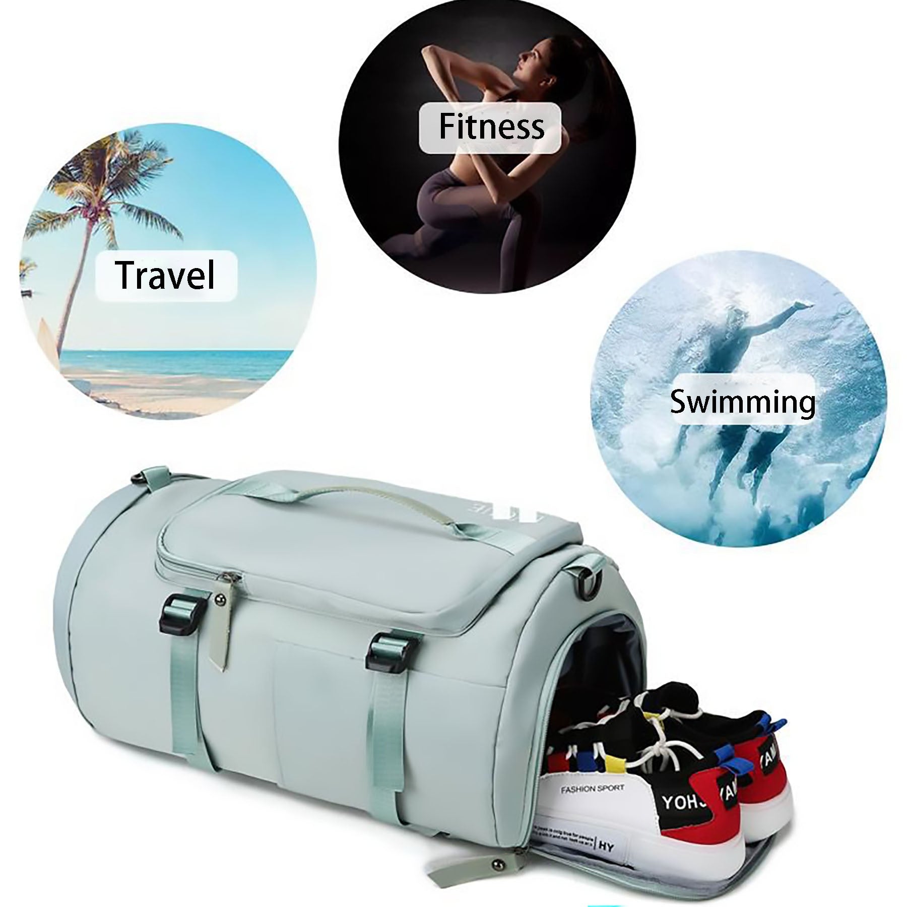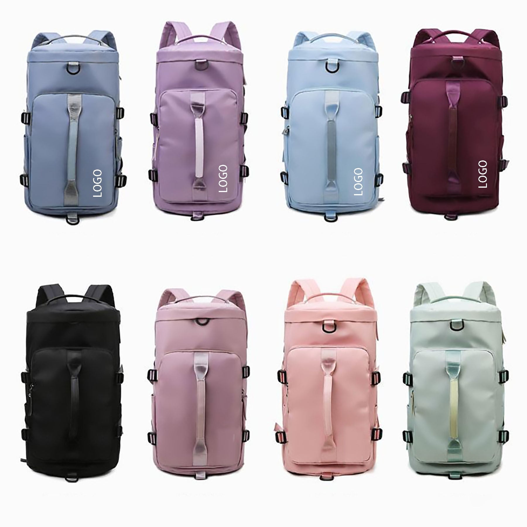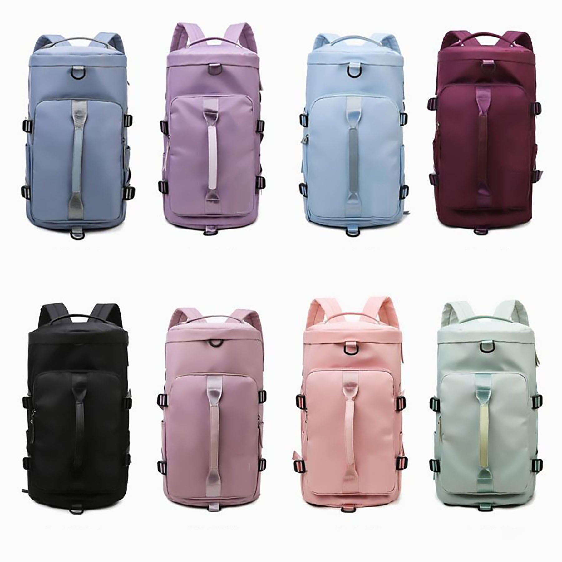 This gym bag has concealable and adjustable straps, a smooth zipper, a main compartment with laptop pocket and wet/dry pocket, side slip pockets, and a shoe compartment. Made from waterproof Oxford fabric, it is durable and versatile for gym, travel, sports, weekends, or everyday use. Available in different colors. 9.48″ L x 9.48″ W x 17.38″ H