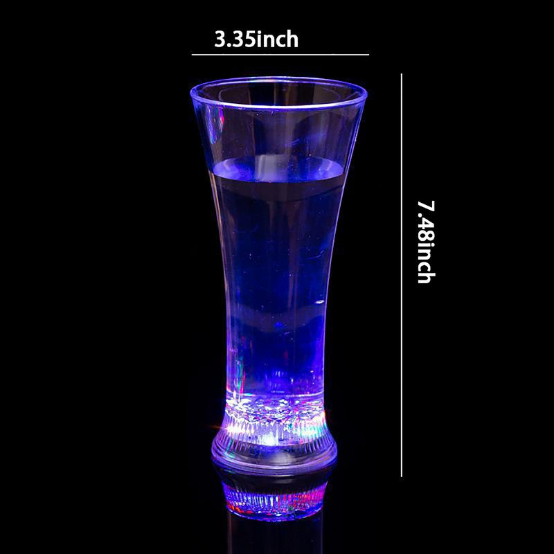 The LED Lighted Cup lights up when liquid is added, creating a fun atmosphere. The cup has red, blue, yellow, and green lights that alternate on their own. The battery is replaceable. For questions about packaging, inventory, or timing. 2 1/2′ L x 3 3/4′ W x 7′ H