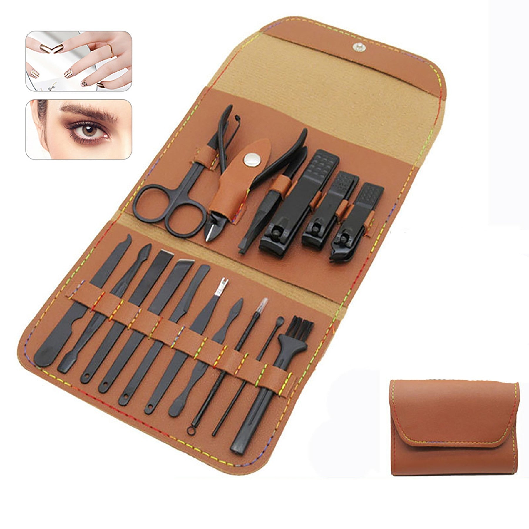 Made of 100% hight quality stainless steel. 18pcs nail clippers set can be used at manicuring, pedicuring, eyebrow shaping, anti-acne, exfoliating, etc. A set of practical nail kit to meet all the needs of the face head and foot care. 6.1″ L x 4.13″ W x 0.98″ H