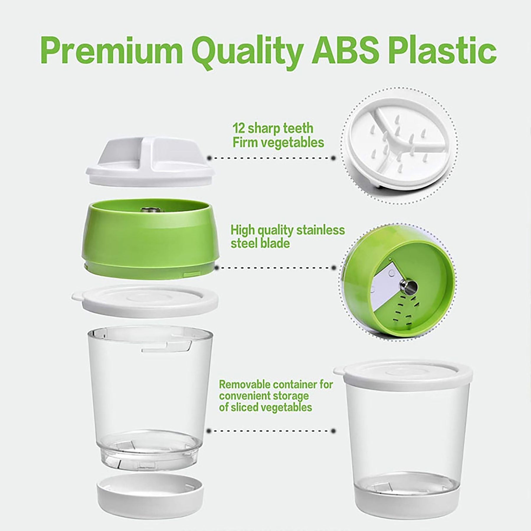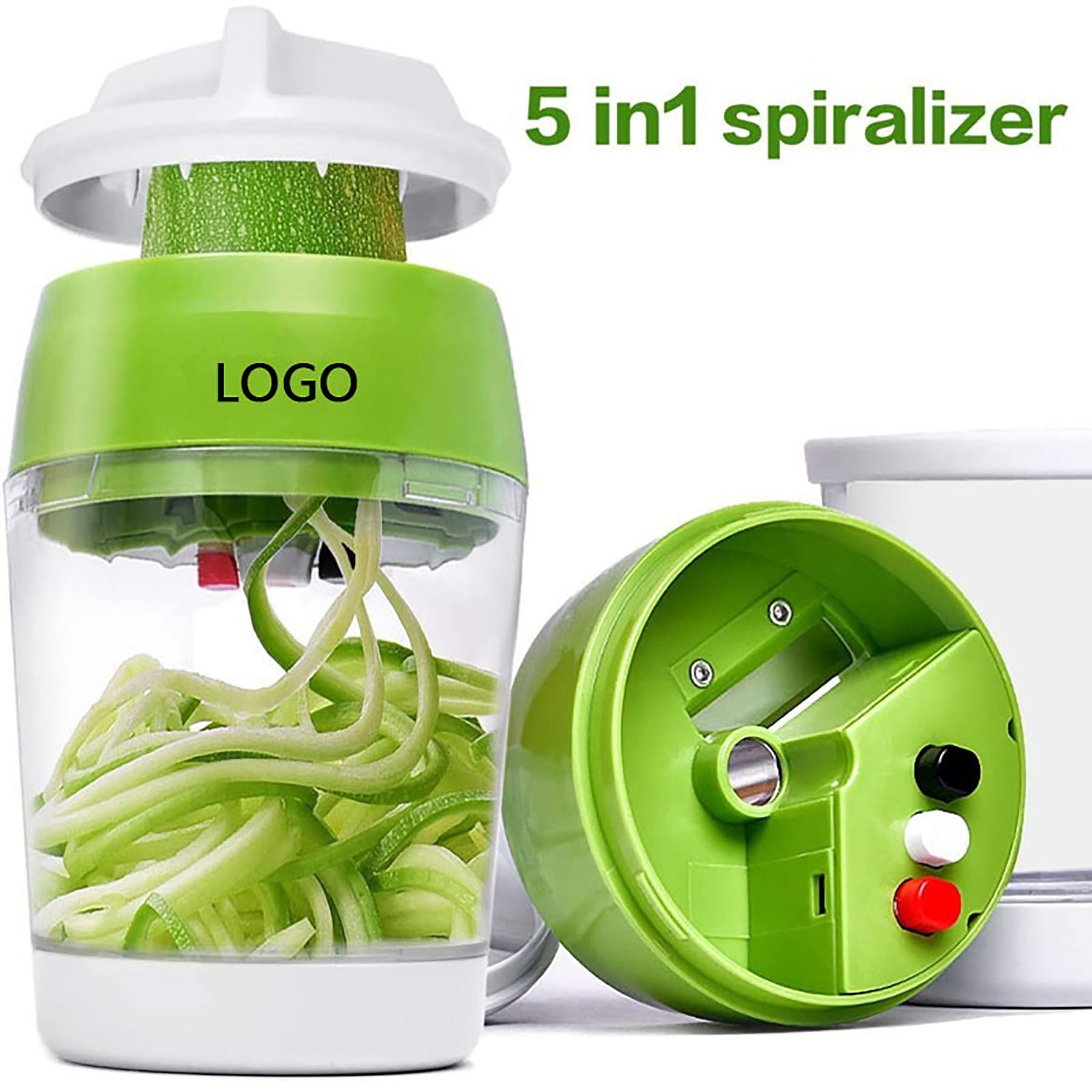 The Spiralizer vegetable slicer is made of high quality, eco-friendly ABS plastic and 304 food grade stainless steel. It has 3 buttons and 4 modes to create vegetables in different sizes with 3 blades. Button 1: julienne cut; Button 2: narrow spiral shape; Buttons 1 + 2: spaghetti shape; Reset key: width spiral shape. Easily switch modes to choose your favorite shapes. The slicer is easy to disassemble and dishwasher safe for easy cleaning. 3.7″ L x 3.7″ W x 6.7″ H