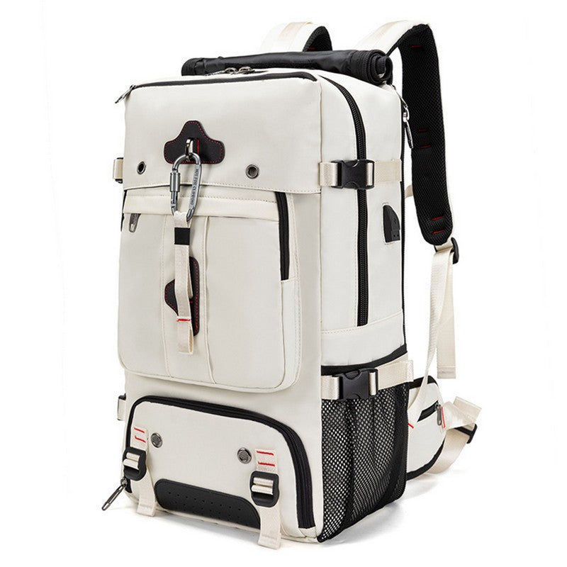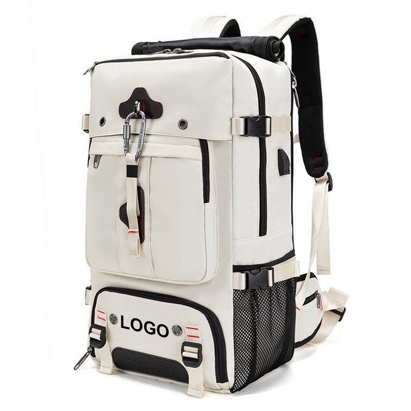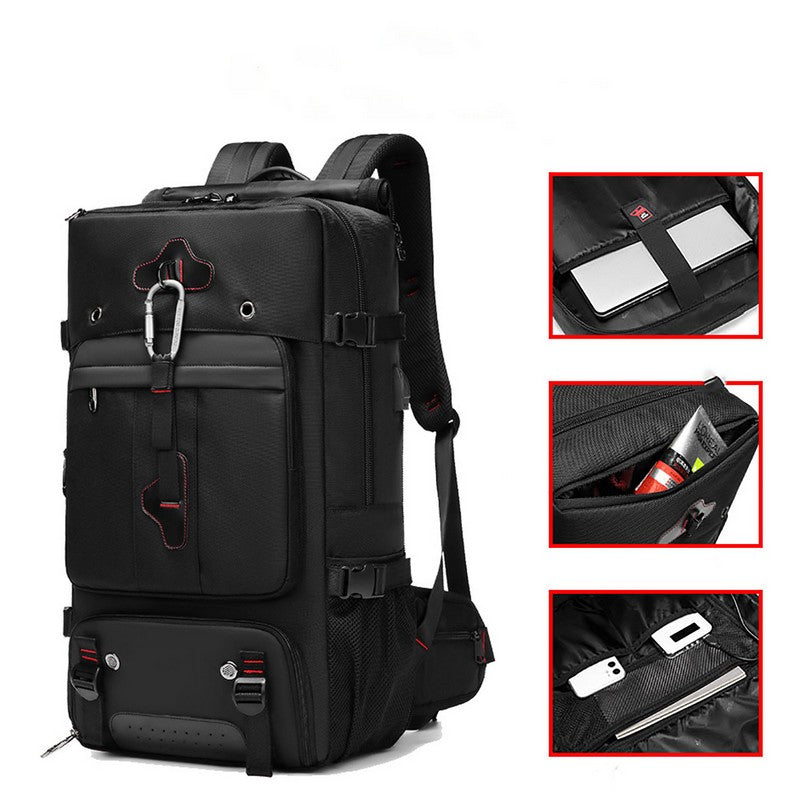 Ergonomic design, breathable material, and adjustable shoulder straps for comfort. Water-resistant, durable material with smooth metal zippers. hidden zip pocket, card zipper pocket, and USB port for charging devices on the go. Large backpack with sturdy handle, steel cable, and side compression straps for size adjustment. 22.83″ L x 12.2″ W x 12.2″ H