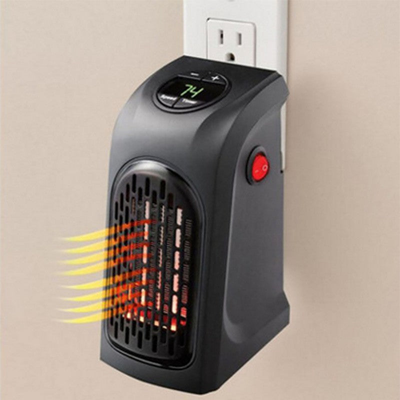 Temperature display and time device with 1-12 hour timer. Four buttons for adjusting temperature, speed, and timer. Red switches for easy operation. Convenient and portable, plugs into wall or socket. Ideal for indoor heating, small spaces, dorms, offices, camping, basements, garages, and more. 6.3′ L x 4′ W x 3.35′ H