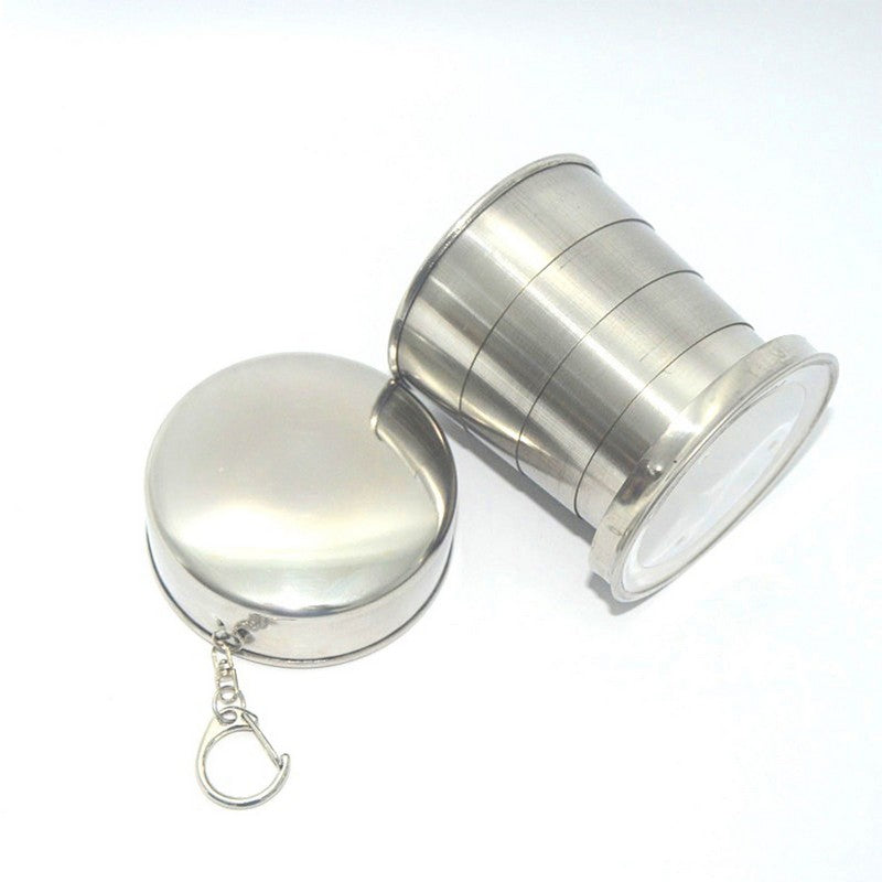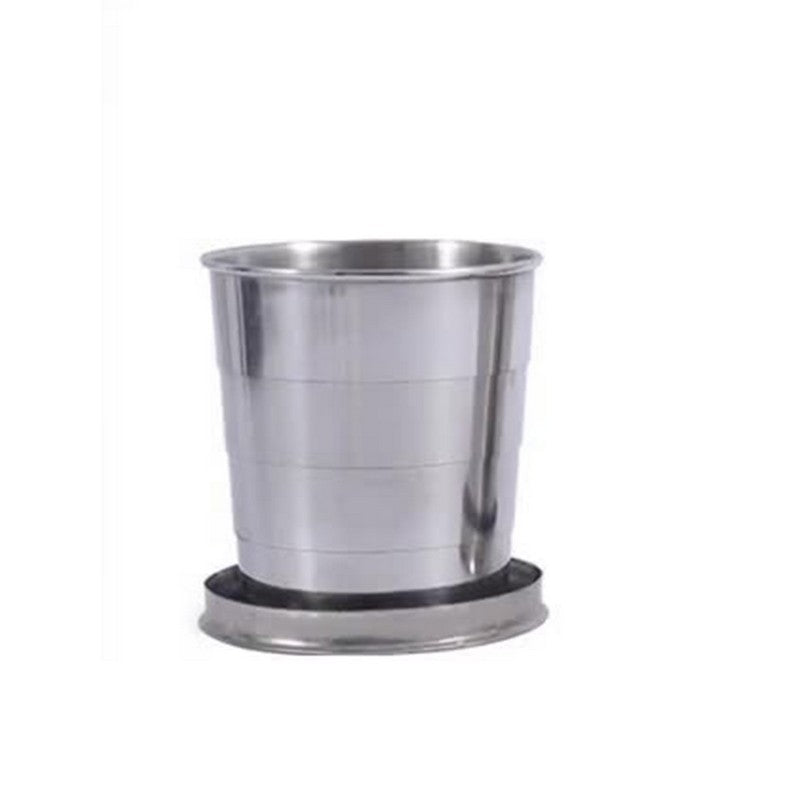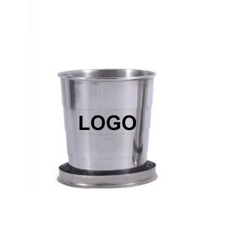Stainless steel folding cup, perfect for travel, camping, hiking, and outdoor activities. Comes in 3 sizes: 8.5oz (250ml, 3 layers), 5oz (150ml, 4 layers), and 2.5oz (750ml, 6 layers). Durable, easy to clean, with key chain and lid for portability. Price is for 5oz, 150ml, 4 layers. Non-toxic, no metal taste or rust. Great for brand promotion with large print size. 2.5″ L x 2.3″ W x 2.3″ H