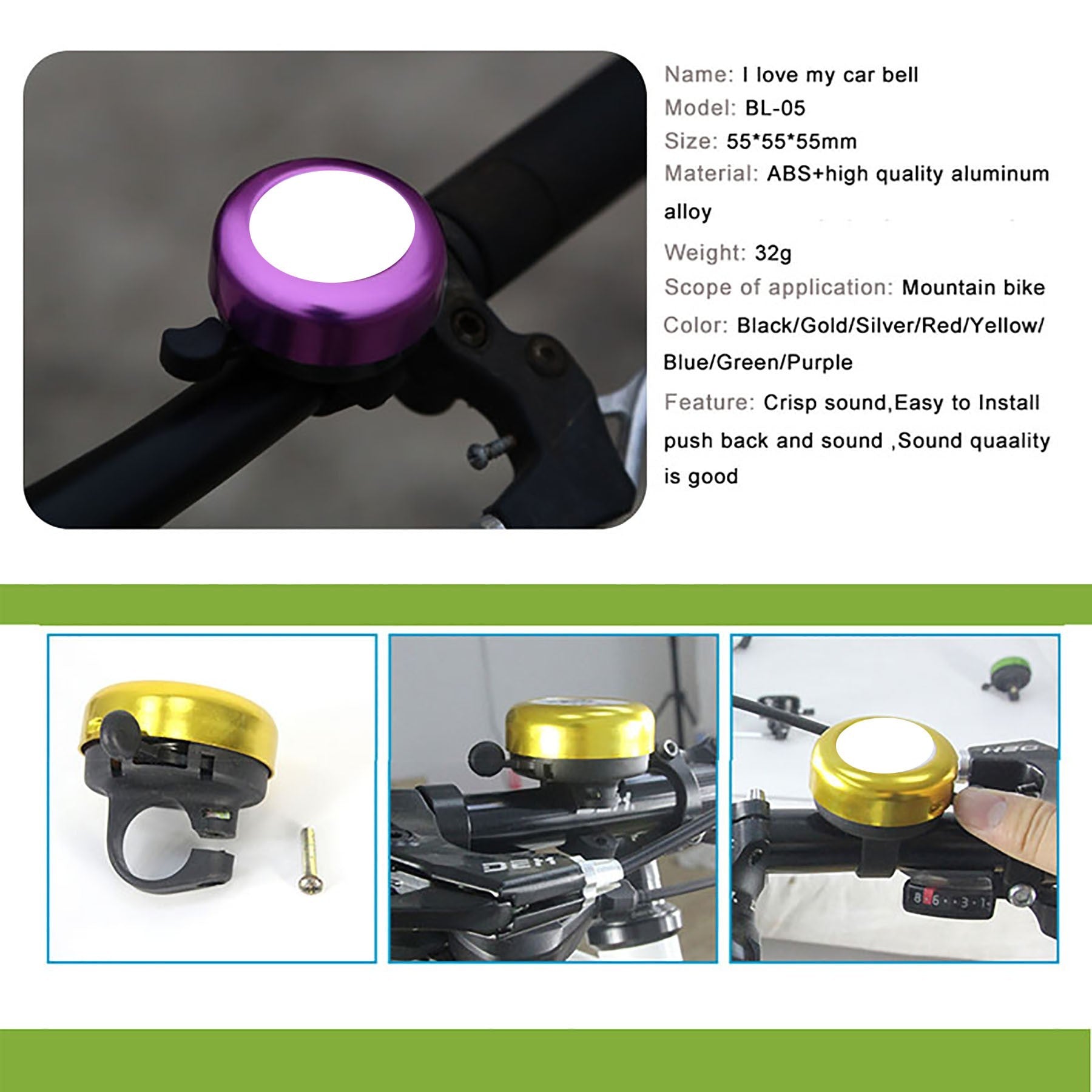 Upgrade your bike with this easy-to-install bell for handlebars 21-23mm. Made of brass and PP, it delivers a clear, sweet, and loud sound. Fits standard straight bicycle, stunt scooter, MTB, and BMX handlebars. Dome diameter of 33mm for maximum effectiveness. Elevate your cycling experience with this stylish bell. 1.2″ L