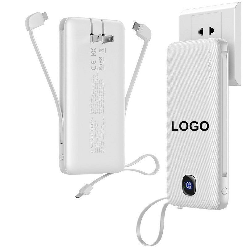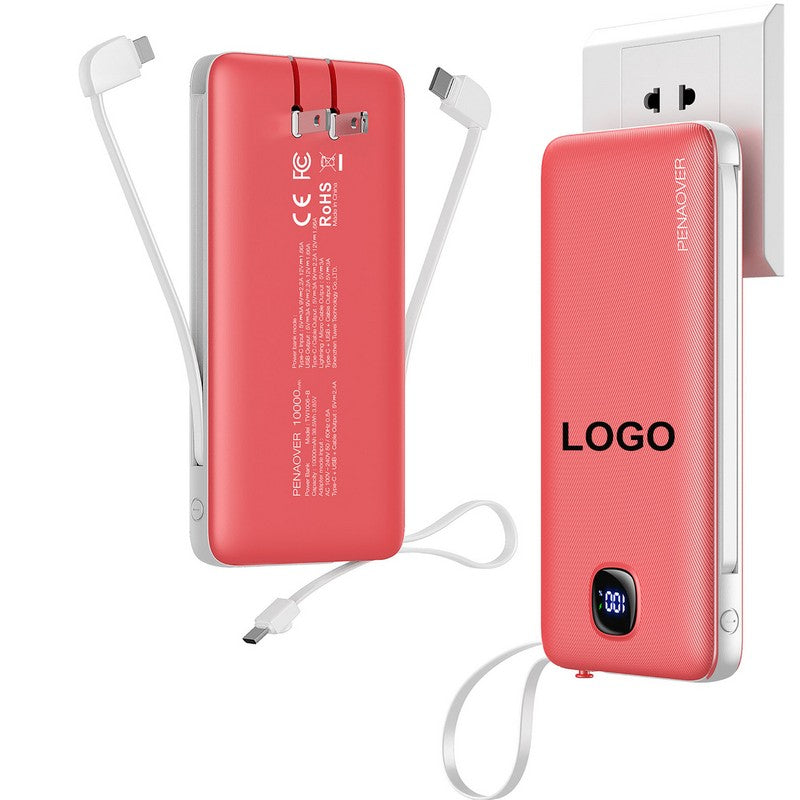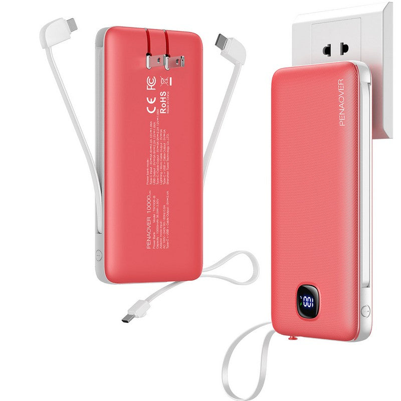 10000mAh portable phone charger built in 3 types cables, Mirco USB, USB C and other type cables, the AC Wall plug built in allows you to recharge itself directly from the wall outlet, do not need to carry adapter and cables everywhere any more. This Portable phone charger is designed with 4 outputs: 2 Cables outputs charging and additional USB C and USB A outputs. It supports 4 devices charging max simultaneously. The bidirectional Type-C ports works as input and output. Each of the cables and USB ports output supports 15W max fast charging. Connected to your device and the external battery would fix with different devices to get fast charging. 2.76′ L x 1.1′ W x 4.49′ H