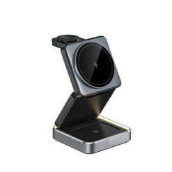 This 3-in-1 magnetic wireless charger is compatible with all qi devices, providing fast power without multiple cables. It integrates seamlessly into your lifestyle at work, home, or while traveling, with a built-in night light. It safety features like foreign object detection, overheating, and short circuit prevention. Durable metal shock-absorbing shafts support the foldable structure for stability at any angle. 2.95′ L x 2.95′ W x 1.44′ H