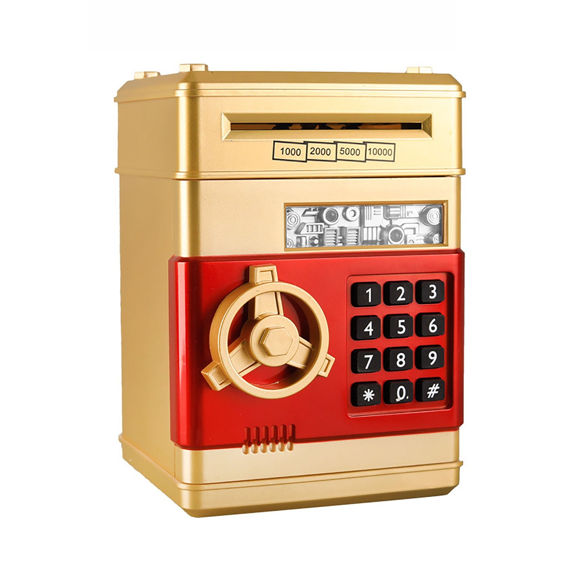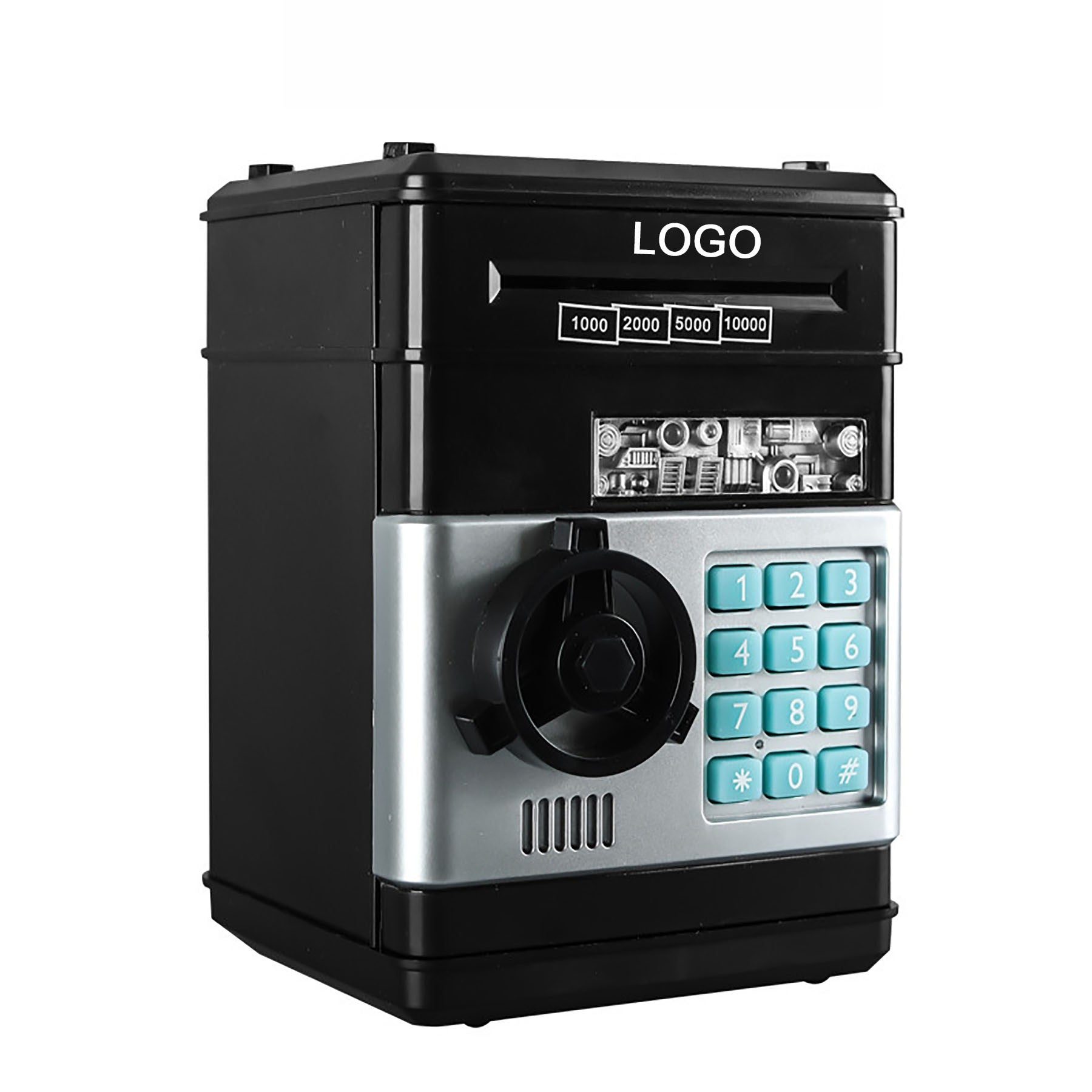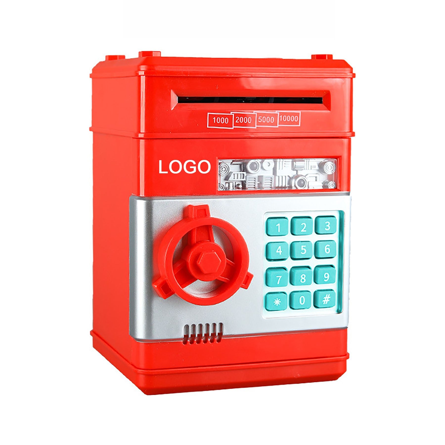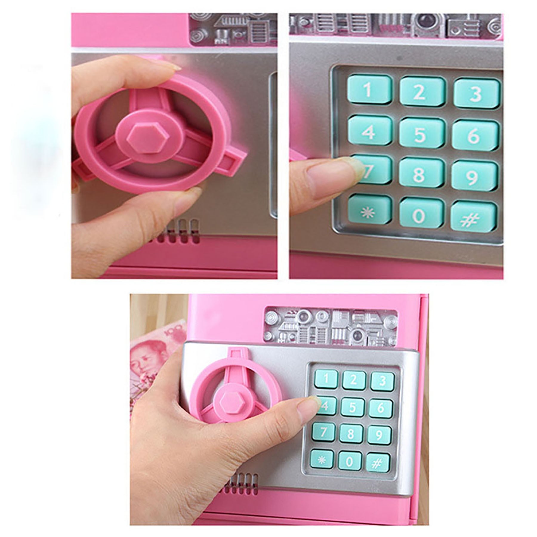 Material: High quality ABS. Safe simulation design. Perfect Christmas gift. Automatic Paper Money Scroll: Roll money into machine automatically. Password Safe Cash Box: Enter 4 digit password to open ATM. Red light and sound if wrong password entered. 5 1/8″ L x 5″ W x 7 3/4″ H