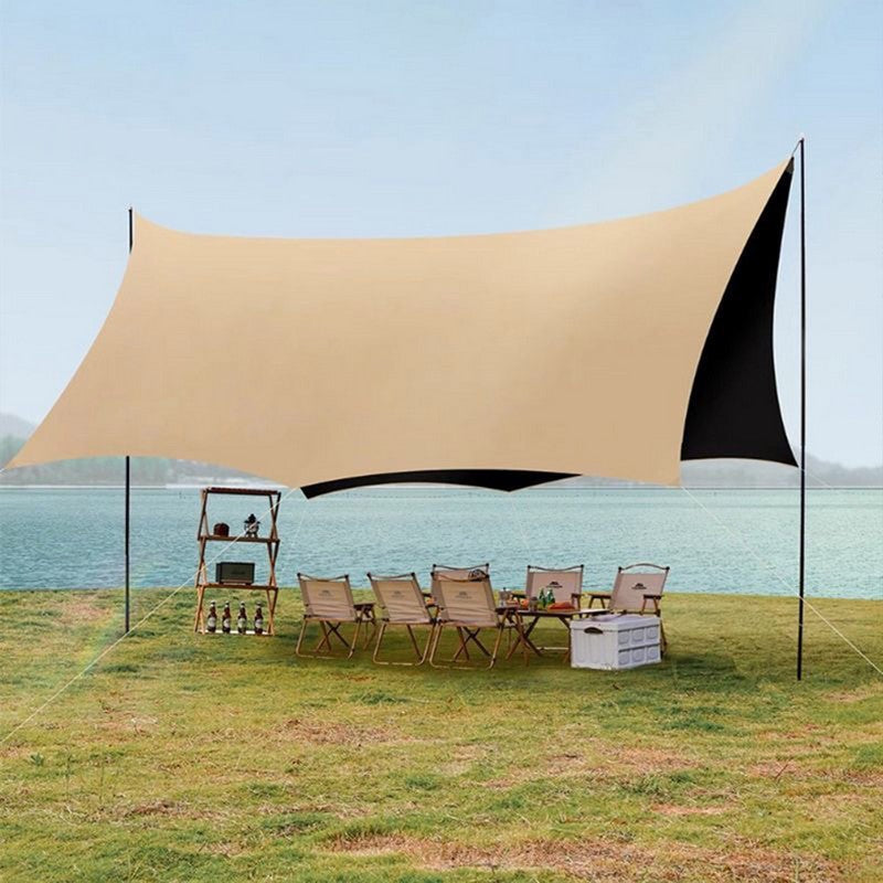 Ideal for new adventurers, this camping tarp offers superior shading, insulation, and UV protection with its silver coating. It serves multiple purposes like a picnic blanket, sun shelter, hammock rain fly, groundsheet, or tent cover. Keeping the ground dry and clean, it provides essential shade for a comfortable outdoor experience. Perfect for hiking, camping, picnicking, or family activities, this versatile tarp is a must-have companion. 204.72″ L x 177.17″ W x 177.17″ H