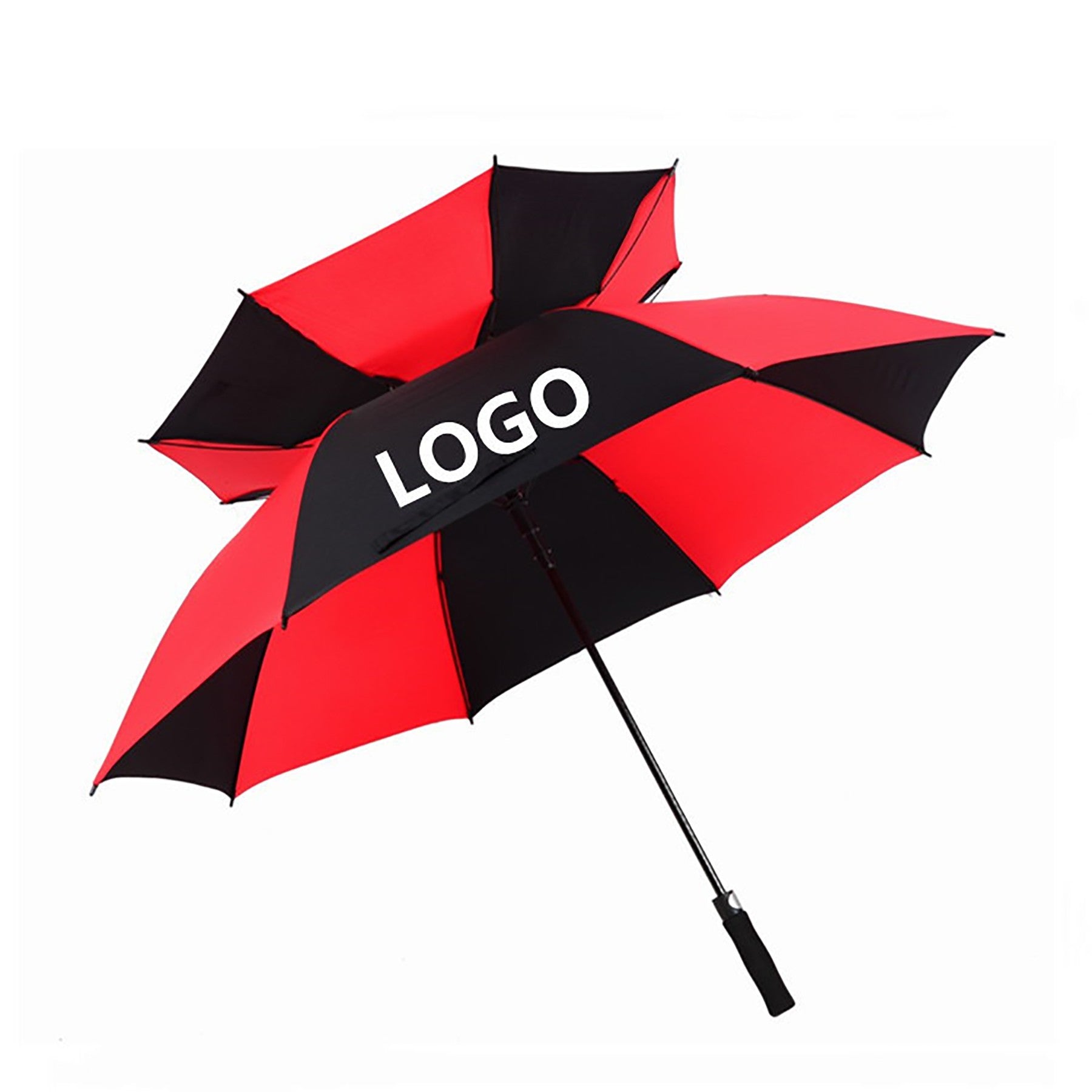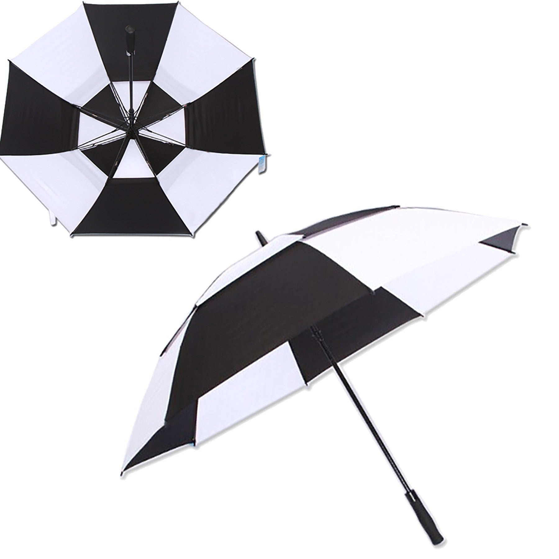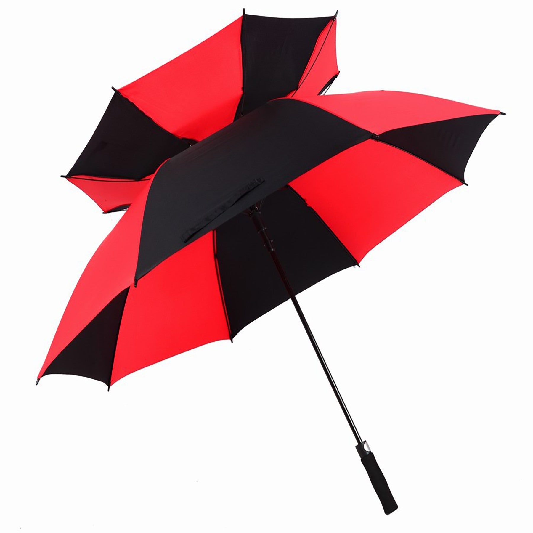 This large umbrella can protect two or more people and is ideal for golf, sports, business, travel, or everyday use. It is strong with resin-reinforced fiberglass ribs and a vented double canopy to prevent flipping. The umbrella is coated with teflon to repel rain. It has an automatic button for easy opening. 47.24′ L x 26.97′ W x 26.97′ H