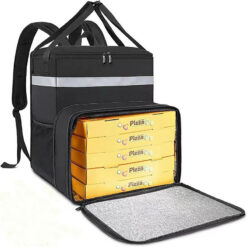 Food delivery bag with padded back and shoulder straps for comfort during long shifts. Made with durable, water-resistant material to withstand wear and tear. Features side cup holders, upgraded strap design, and reinforced stitching for secure drink storage. Leak-proof and insulated liner keeps food hot or cold for hours. Reflective strips for visibility at night. Front pocket for napkins, utensils, and condiments. Transparent pocket for order labels. 13.78′ L x 9.84′ W x 9.84′ H