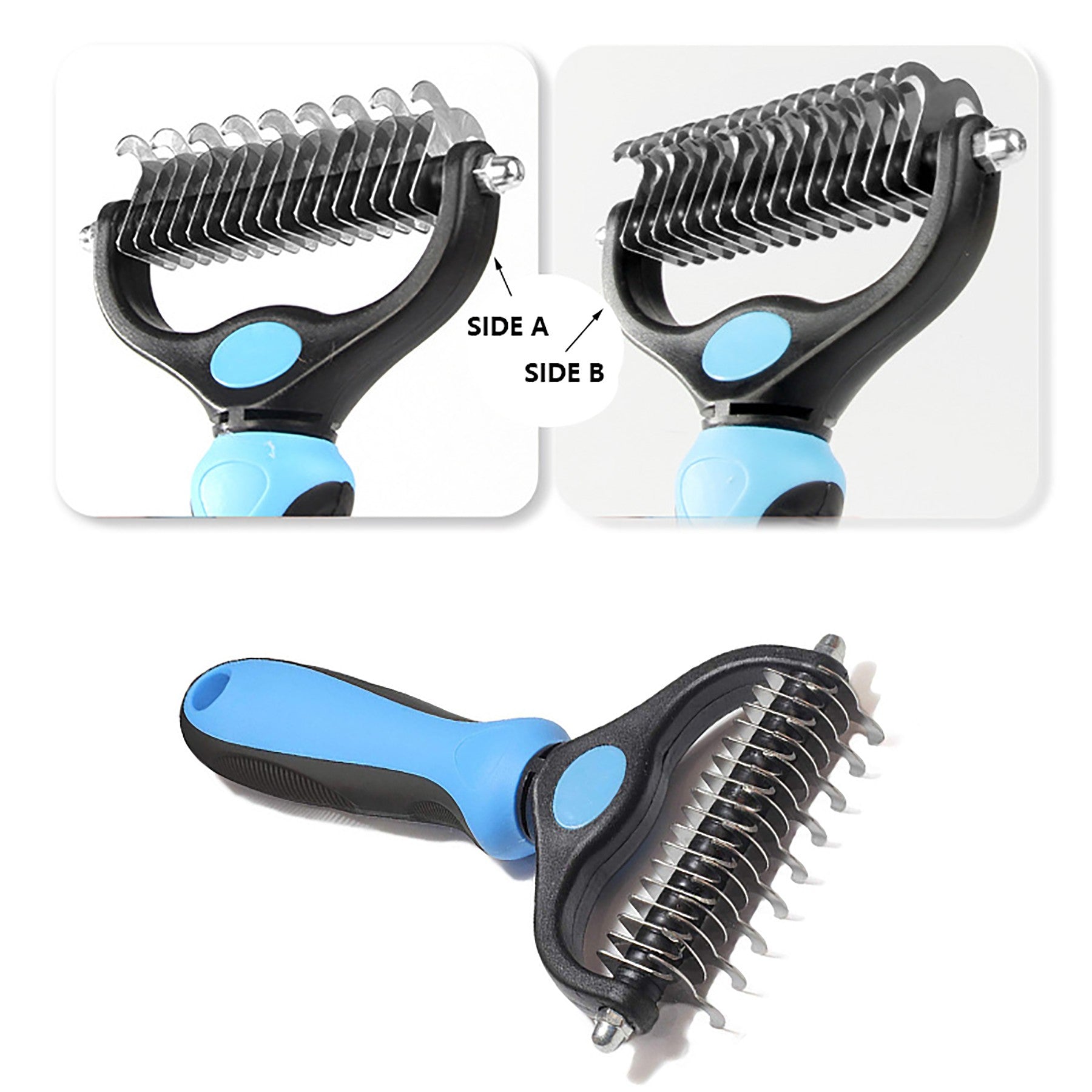 This pet grooming tool not only works as a de-matting brush or detangling comb but also can be used as an undercoat comb or de-shedding rake/brush. High-quality stainless steel teeth, no-rust and durable, easy to clean. The teeth’ inner side is sharp enough to smoothly cut through the toughest mats, tangles, and knots without scratch and pain. 6 7/8″ L x 4″ W
