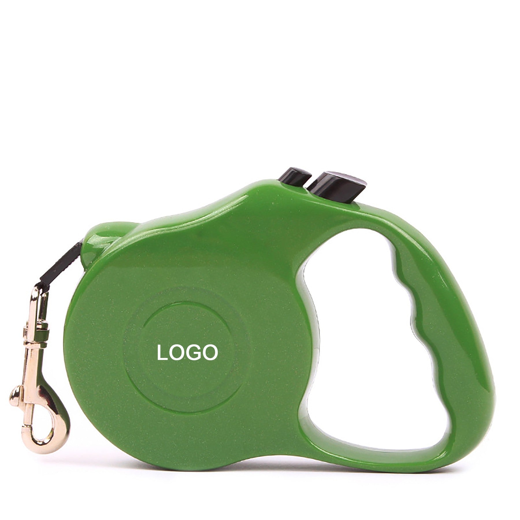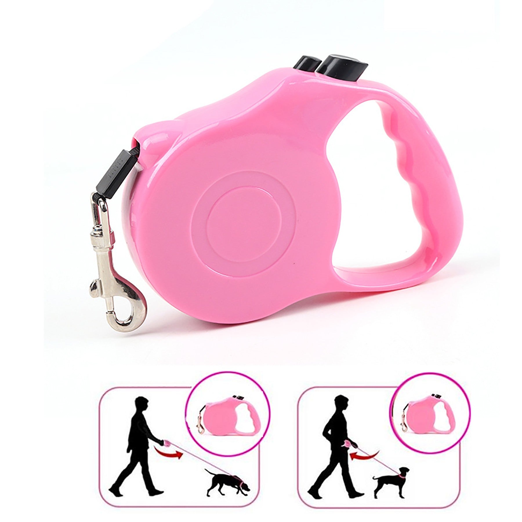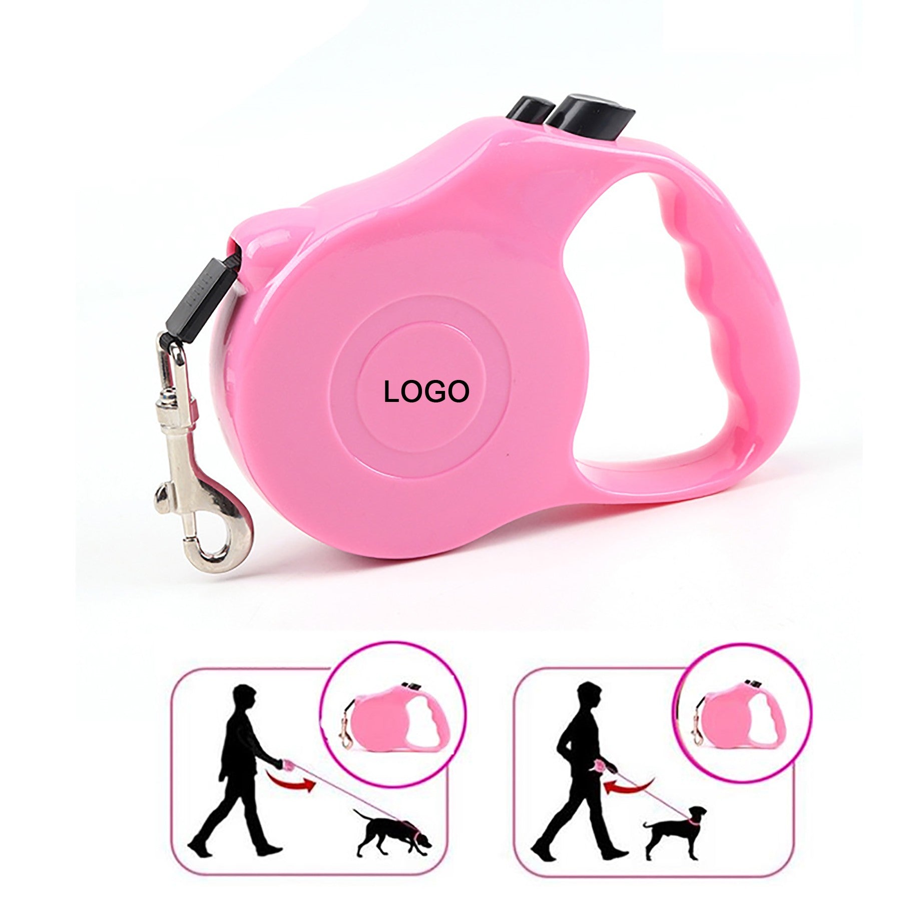 The hook is made of kirsite. The ABS shell can be printed your logo on it. The nylon rope is 118″. The nylon rope is lengthen and shorten Unrestrictedly. You can use one finger to control your pet’s range of motion, to make sure your pet is safe, avoid lost or accident. This rope features a retractable design and braking system to give your pet the feeling of liberty while letting you keep your four-legged friend nearby. Enjoy the outdoors with peace of mind with the Traction Rope for dogs. 5 1/2″ L x 3/4″ W x 4 3/4″ H