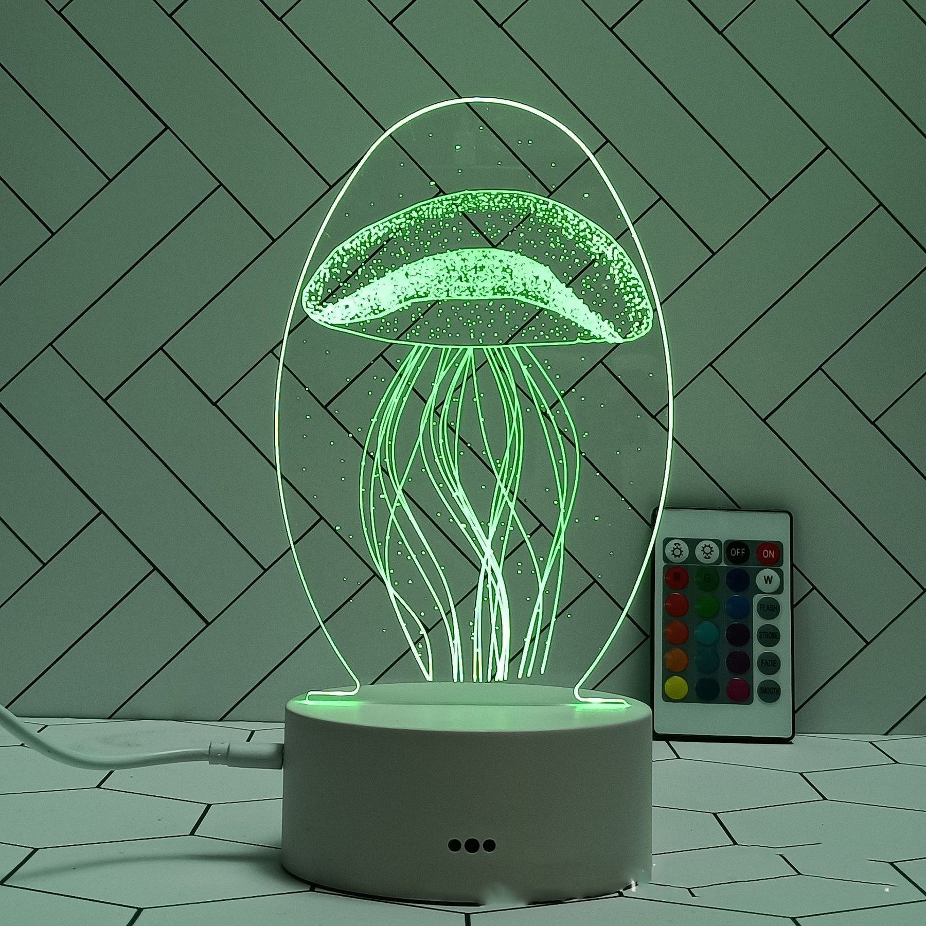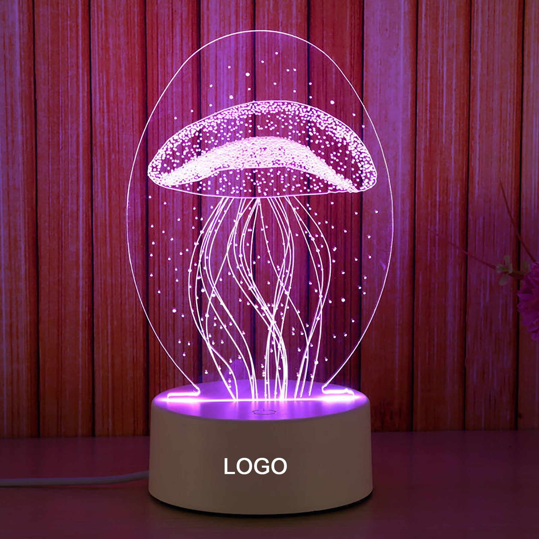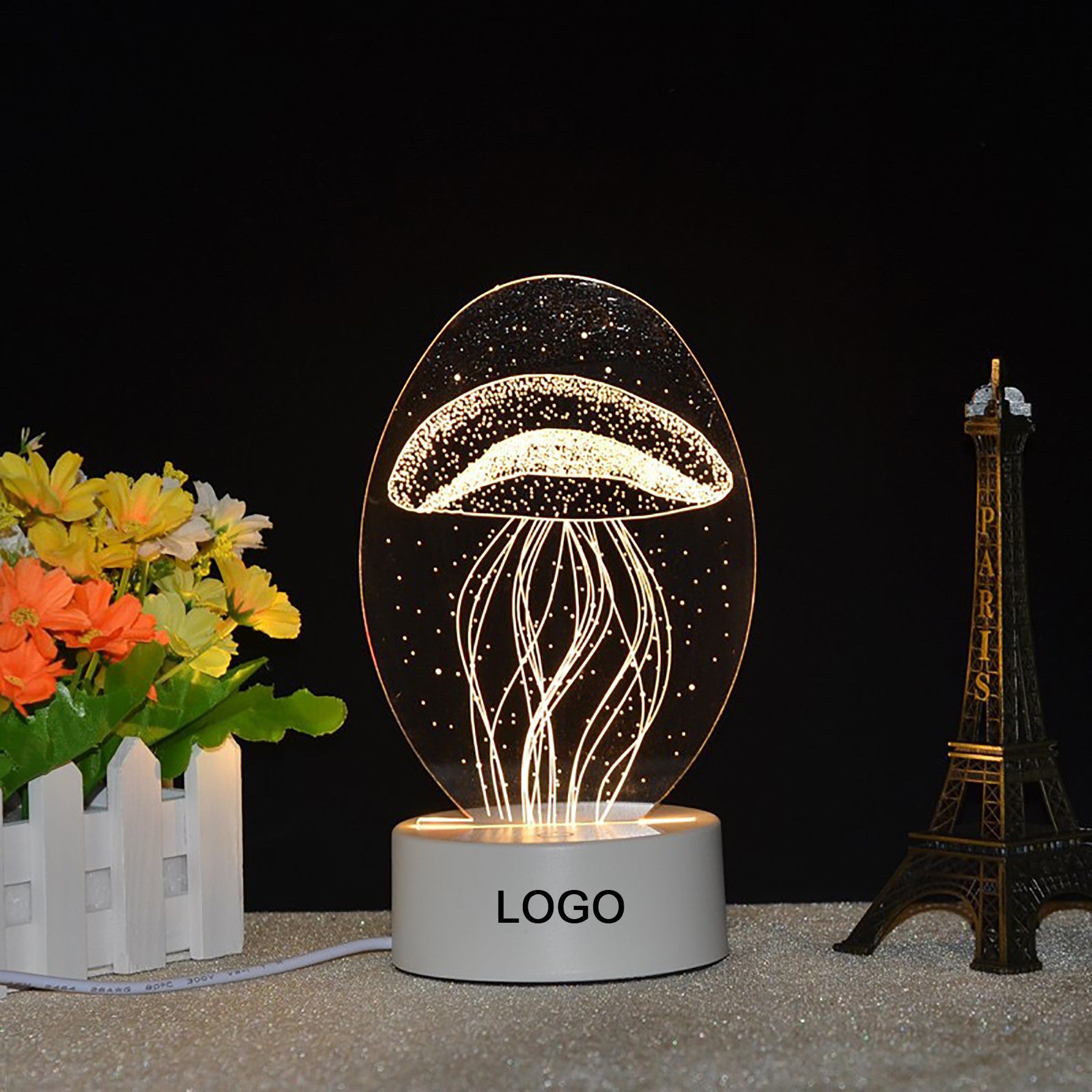 The acrylic top light makes a magic 3D illusion, especially in the dark. The vision thrill will be intense! The touch button controls the color change of the illusion light. (with seven colors red, green, blue, yellow, cyan, purple, white, adjustable one color or colorful gradient). They are powered by 3xAA batteries(not included) and a USB cable. This LED lamp is perfect for bedrooms, bars, shops, cafes, restaurants. Custom shapes and logos are available. 3 3/4″ L x 1 5/8″ W
