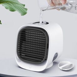 Made of high quality plastic material, shock resistant and durable.Portable air conditioner cooler cools, humidifies and purifies the air around you.Easy to operate, you can fill the cold water with ice cubes to make the humidified cold air atomized. Easy to clean, carry and fill.There are three air speed settings and low power consumption. 6.1′ L x 5.71′ W x 5.71′ H