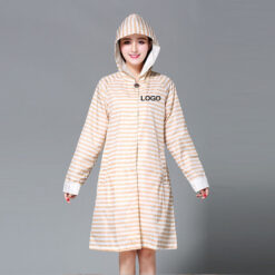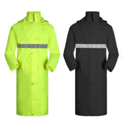 The polyester fiber raincoat is made of 240t high-density polyester cloth with PVC coating, in a long style below the knees. It provides protection in rainy weather with a big brim hat to prevent rain splashing. The design small and big plackets with a zip and buttons for warmth, double-cuff design, and reflective stripes for safety. The adjustable draw cord on the hat provides extra space. The raincoat is lightweight, foldable, and portable, suitable for all seasons. 51′ L x 27′ W x 27′ H